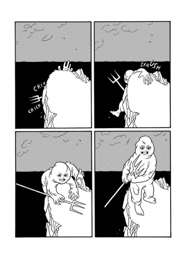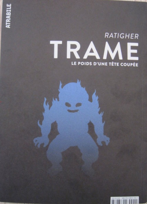 Résumé: Trame se présente, à première vue, comme un pur thriller, plein de suspens et de rebondissements: un jeune couple, que l’on devine plutôt aisé, s’apprête à s’embarquer pour une soirée de fête dans la maison d’un ami. C’est alors qu’apparaît une étrange créature, un monstre peu ragoûtant armé d’un trident, franchement menaçant et au discours ouvertement anti-bourgeois, voire anti-capitaliste. Et ce n’est que le début, le début d’une nuit qui va rapidement tourner au cauchemar, une véritable virée en enfer, où les rares moments de saluts apparents et d’accalmie débouchent inexorablement vers le pire, et l’horreur. Mais ce n’est pas tout, car l’auteur, histoire de pimenter son intrigue, joue avec le lecteur grâce à un procédé de «flash forward» lui laissant entrevoir partiellement ce qui va arriver… Si le procédé, malin en diable, pourra d’abord désarçonner, une fois accepté par le lecteur-complice, il ne fera alors qu’augmenter la tension inhérente, jusqu’à un final «hors champs» que l’on devine extrême… Trame, le poids d’une tête coupée (aah, ce sous-titre!) fait partie de ces objets difficilement descriptibles (comme on les affectionne tout particulièrement chez Atrabile), allant puiser son inspiration dans plusieurs sources, du comics rentre-dedans aux œuvres plus politiques. Car Trame est une véritable petite bombe, un cocktail molotov à la recette bien particulière: une bonne dose de genre façon série noire, une autre de critique sociale frontale et intrigante, et une pincée d’expérimentation pour donner à tout ça une saveur vraiment unique, et explosive.