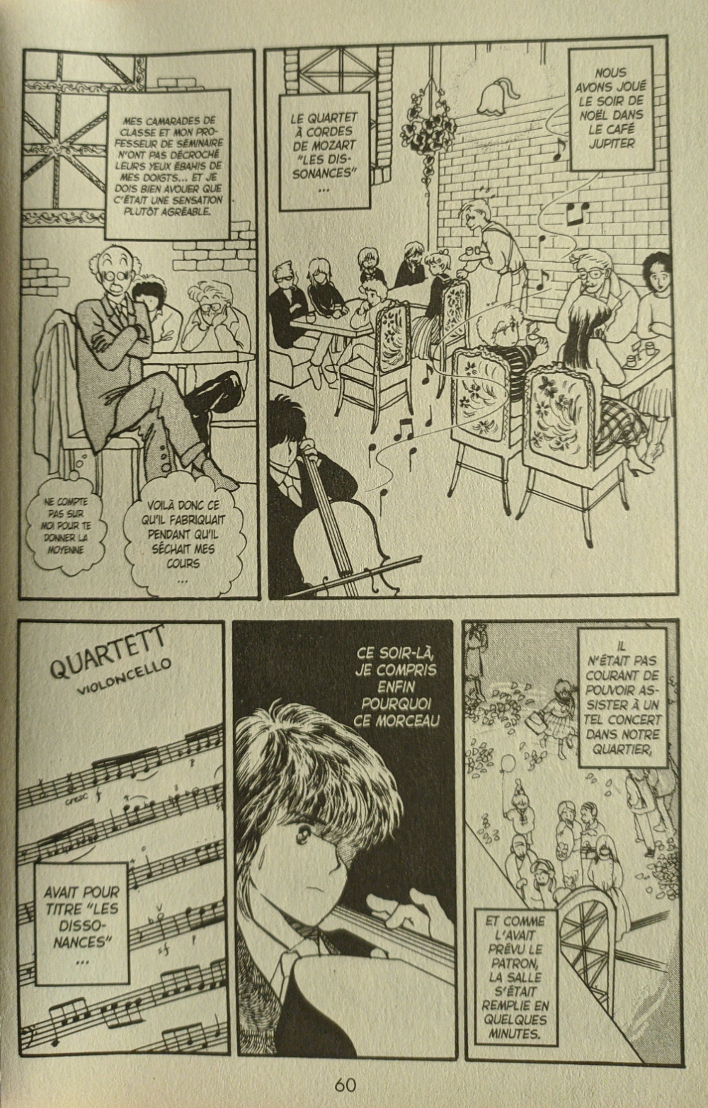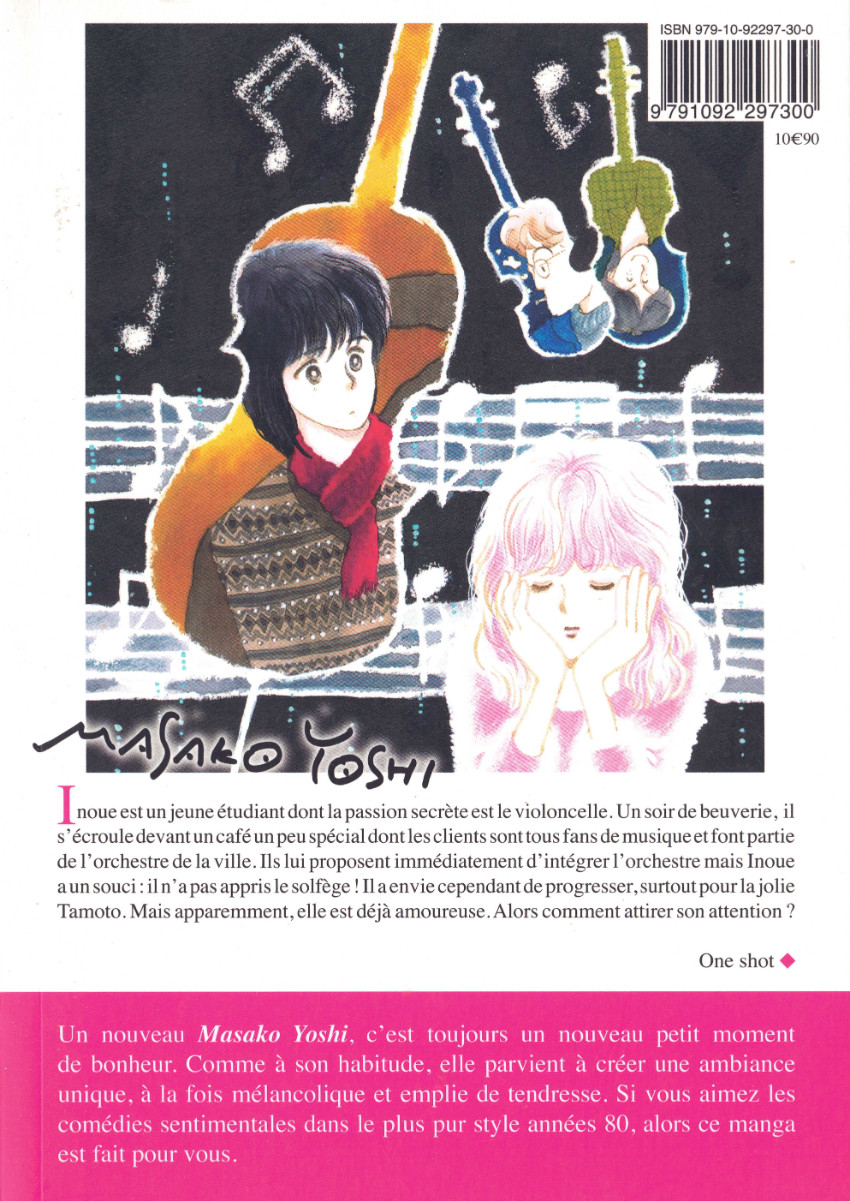 Résumé: Inoue est un jeune étudiant dont la passion secrète est le violoncelle. Un soir de beuverie, il s'écroule devant un café un peu spécial dont les clients sont tous fans de musique et font partie de l'orchestre de la ville. Ils lui proposent immédiatement d'intégrer l'orchestre mais Inoue a un souci : il n'a pas appris le solfège ! Il a envie cependant de progresser, surtout pour la jolie Tamoto. Mais apparemment, elle est déjà amoureuse. Alors comment attirer son attention ?