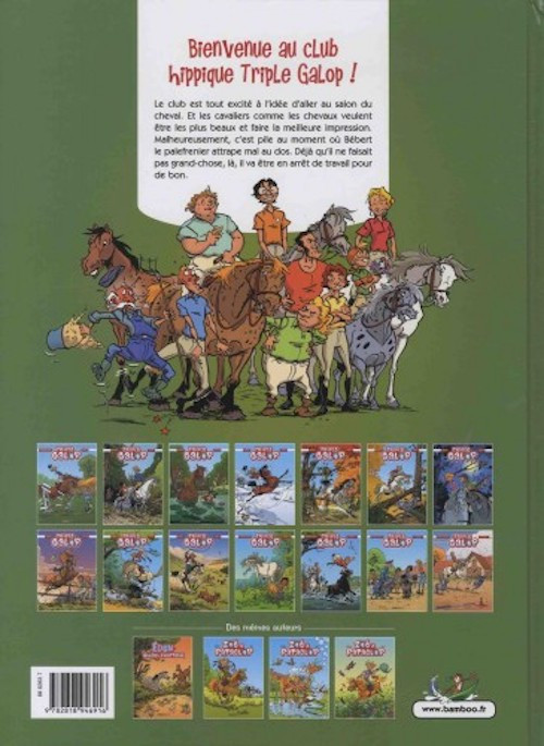 Le club est en émoi. Tout le monde se prépare à aller au salon du cheval. Et les cavaliers comme les chevaux veulent être les plus beaux et faire la meilleure impression. Malheureusement, c'est pile le moment que Bébert, le palefrenier, choisit pour avoir mal au dos. Déjà qu'il ne faisait pas grand-chose, là, il est en arrêt de travail pour de bon. C'est sûr, maintenant, les préparatifs vont aller au pas !