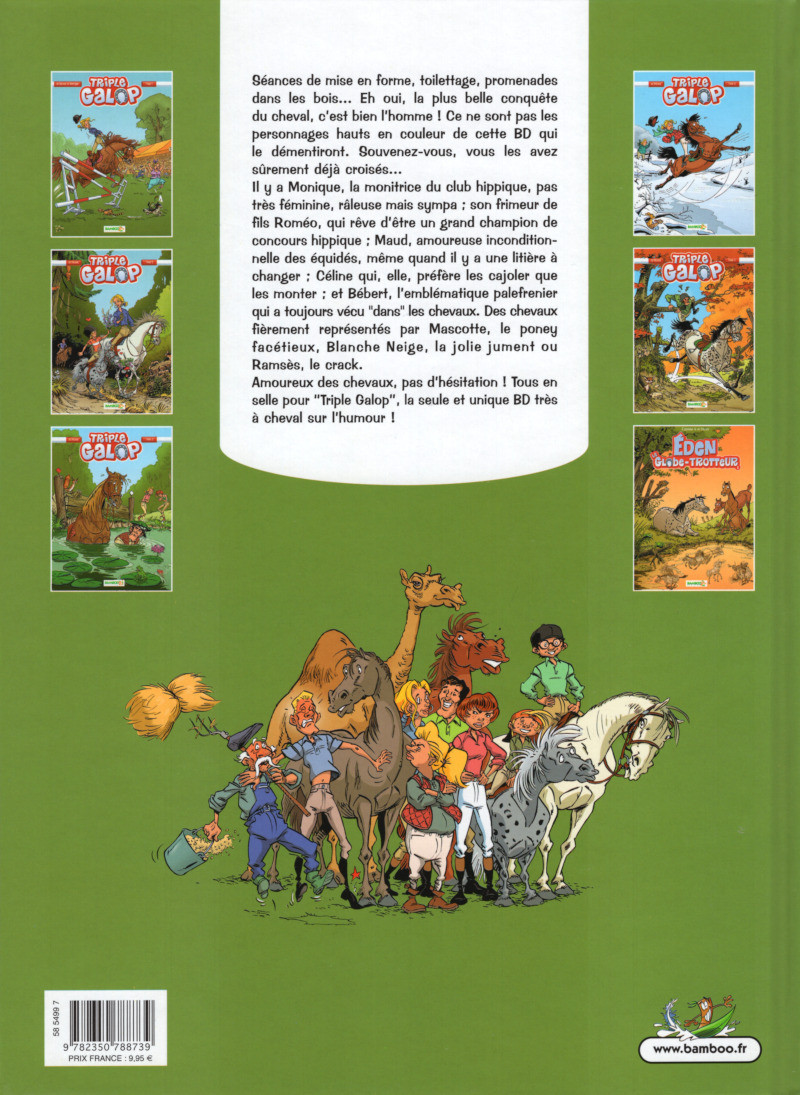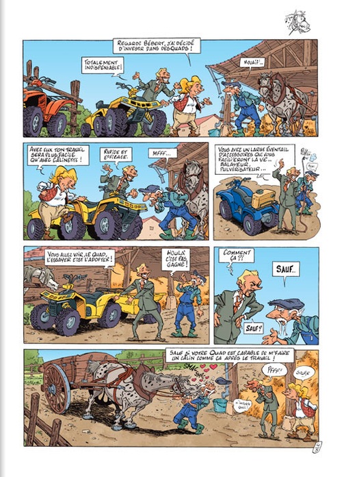 Résumé: Par le biais du quad, le moteur à explosion fera-t-il son entrée au club hippique ? La directrice croit dur comme fer que ces motos à quatre roues sont rapides et sûres. Roméo, le bellâtre écervelé, s'amuse comme un fou à chevaucher ces engins. Cependant, le vieux Bébert ne jure que par les canassons. À l'aide de Calinette, sa paisible percheronne, le palefrenier chafouin se fait fort de montrer à tous qu'aucune mécanique ne sera supérieure à la puissance animale. La communauté chevaline n'en pense pas moins. Dès que les hommes ont le dos tourné, les chevaux s'expriment enfin par le verbe. Des brèves de prairies à bride abattue !