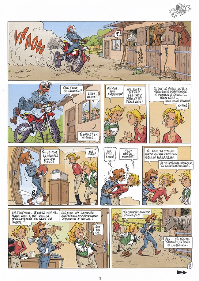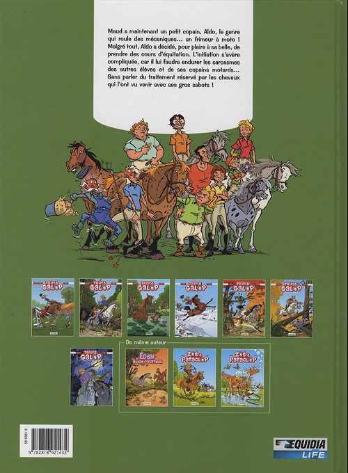 Résumé: La série très à cheval sur l’humour est de retour !Maud a maintenant un petit copain, Aldo, le genre qui roule des mécaniques… un frimeur à moto ! Malgré tout, Aldo a décidé pour plaire à sa belle de prendre des cours d’équitation. L’initiation s’avère compliquée, car il lui faudra endurer les sarcasmes des autres élèves et de ses copains motards… Sans parler du traitement réservé par les chevaux qui l’ont vu venir avec ses gros sabots !