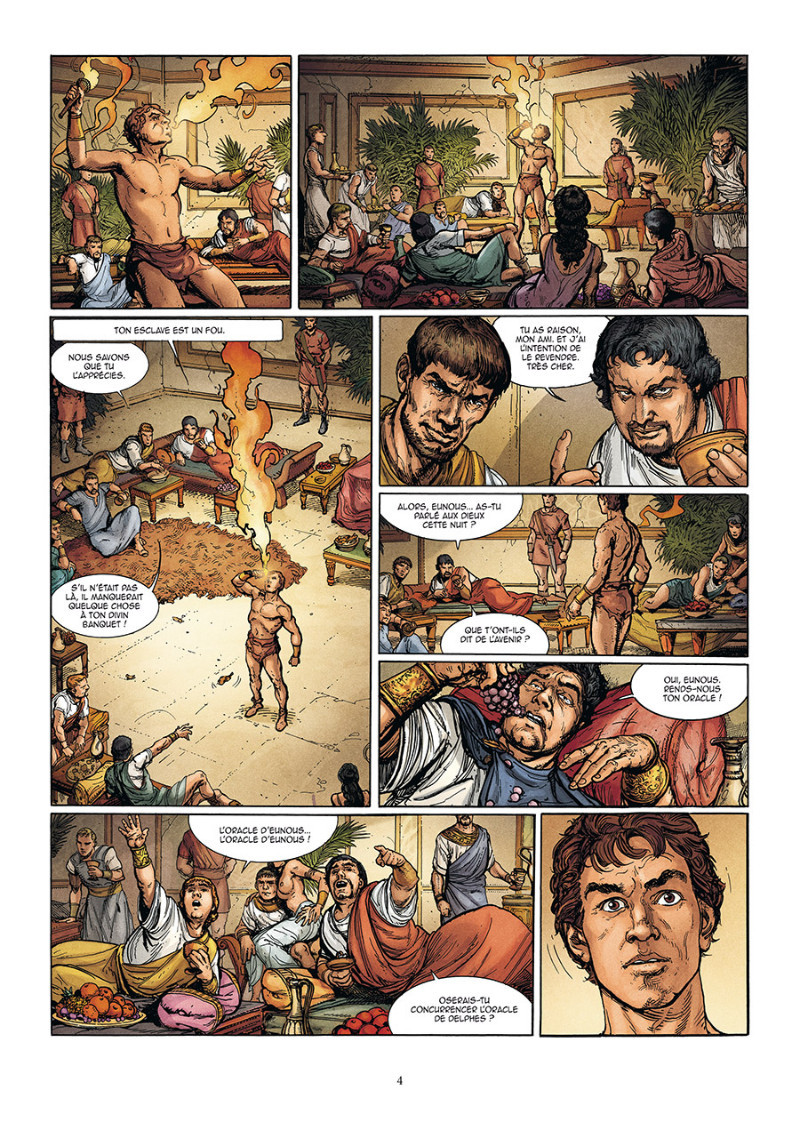 Résumé: Lors d’un banquet fastueux et orgiaque donné par le cruel Damophile, l’esclave Eunous, versé dans la magie et le mysticisme, se met en scène pour les convives. Alors qu’il crache du feu et amuse l’assistance, qui le prend pour un fou, un bouffon, Eunous s’immobilise brusquement et clame : « Un jour, je serai roi ! ».