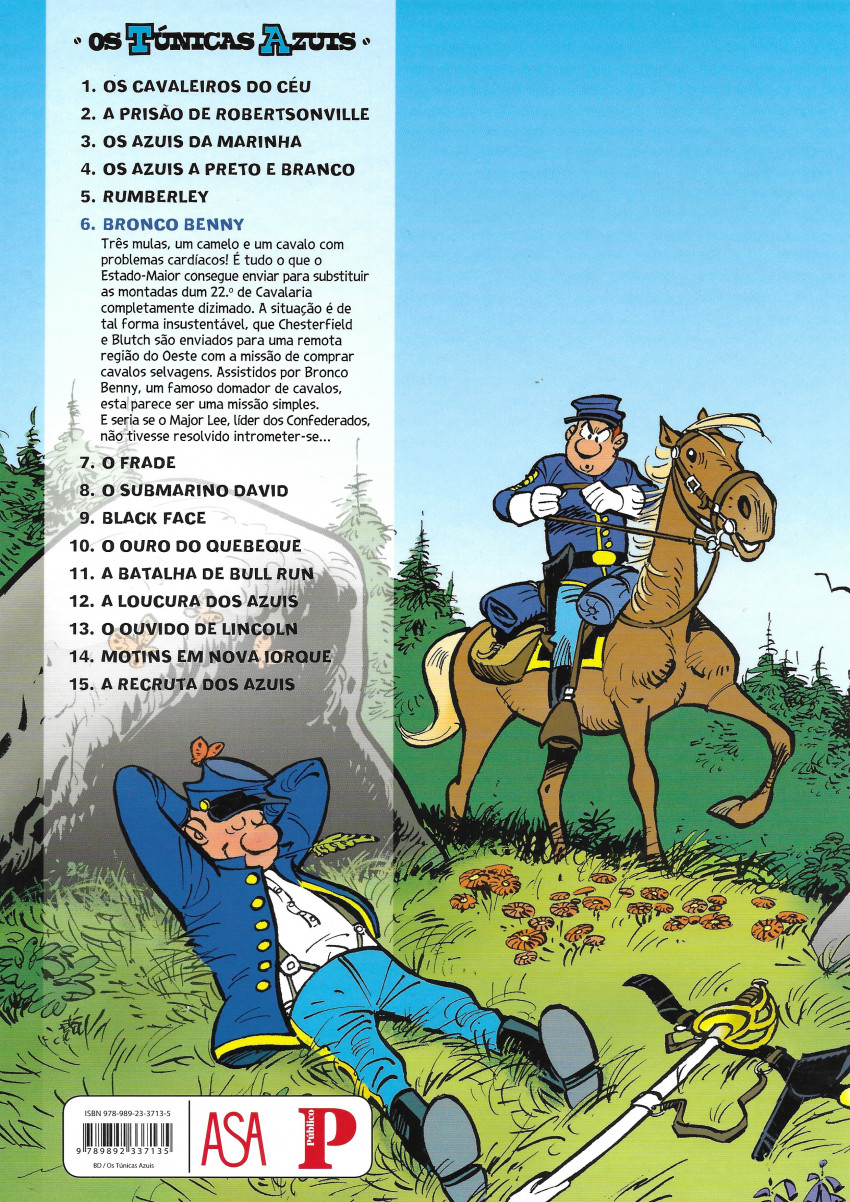 Résumé: Três mulas, um camelo e um cavalo com problemas cardíacos! É tudo o que o Estado-Maior consegue enviar para substituir as montadas dum 22º de Cavalaria completamente dizimado. A situação é de tal forma insustentável, que Chesterfield e Blutch são enviados para uma remota região do Oeste com a missão de comprar cavalos selvagens. Assistidos por Bronco Benny, um famoso domador de cavalos, esta parece ser uma missão simples. E seria se o Major Lee, líder dos Confederados, não tivesse resolvido intrometer-se…