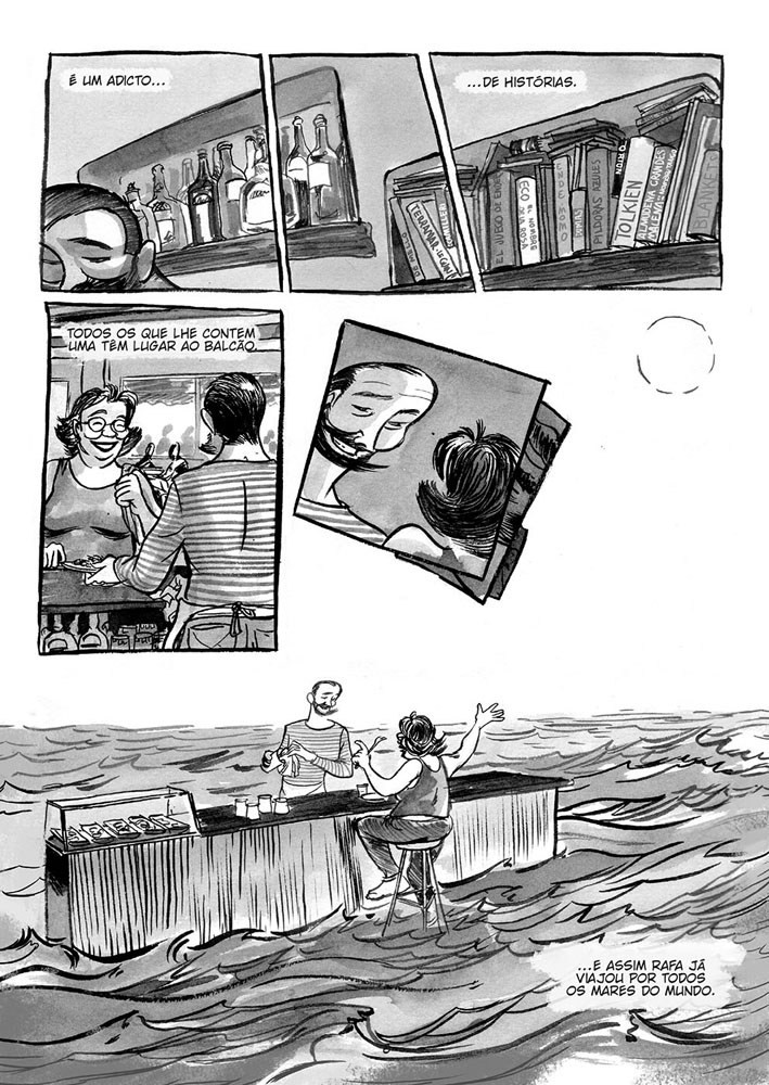 Em O Bar do Barbudo contam-se histórias que sabem a sal, à brisa do mar e a uma chávena de café. É ao balcão do seu bar que Rafa, o barbudo dono, ouve as histórias que os seus clientes lhe contam, em troca de comida ou de bebida, viajando deste modo por todos os mares do mundo, sem sair da sua pequena ilha.