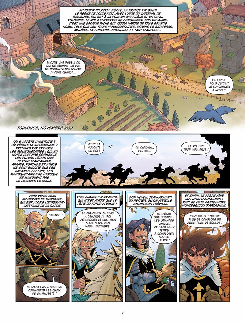 Telle une préquelle au roman Les Trois mousquetaires, cet album se veut à la fois détaché et respectueux de l'œuvre dont il est inspiré. Respectueux du cadre historique tout d'abord. Richelieu, Louis XIII, Tréville, comme le contexte politique de l'époque sont exposés. Mais aussi et surtout les hommes qui ont inspiré l'écrivain : Isaac de Portau, Henri d'Aramitz et Charles de Batz de Castelmore. Plutôt que de livrer une énième adaptation, l'auteur revient aux sources d'Alexandre Dumas et imagine l'adolescence de ces personnages avant qu'ils ne deviennent les héros passés à la postérité. Tout en respectant les relations entre chacun d'eux (notamment les liens de parenté), il n'hésite pas à s'émanciper de la réalité (en insérant d'illustres contemporains aux côtés des apprentis mousquetaires par exemple). Que les amateurs d'intrigues de cape et d'épée se rassurent, escrime, trahison, duels et complots sont bien de la partie. L'humour également, distillé avec parcimonie, il ponctue la lecture sans jamais l'alourdir. Au final, en plus de poser les bases des péripéties que tout le monde connait, agrémenté de nombreux clins d'œil au livre, ce titre offre une histoire complète.