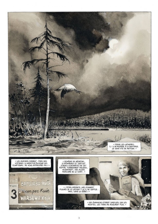 Comme en écho à ce printemps « rayonnant », à cette victoire de la flore et de la faune après le désastre technologique, se découvre la renaissance artistique de Lepage. Ceux qui l'ont croisé en festival à cette époque se souviennent des problèmes récurrents du dessinateur, cette main quasi paralysée, une attelle au poignet, les doutes sur son avenir dans le métier. Parti en Ukraine sans être véritablement sûr de pouvoir tenir ses engagements, il retrouvera pourtant ses sensations, finira par oublier les douleurs tenaces qui le bloquaient. En témoignent les croquis sur le vif réalisés là-bas, les pastels et les aquarelles insérés dans le corps de cette mise en abîme de son travail d’alors. Ces études agissent comme autant d’instantanés, éclairant le lecteur sur la réalité perçue à l’époque par le narrateur, et viennent en contrepoint du récit contemporain mettant en scène les souvenirs et les ressentis. Formellement, dans la continuité de son précédent opus, il encre de lavis noirs et bistres ses crayonnés, parfois laissés apparents, avant une retouche numérique pour ajouter de la profondeur et créer des effets de matières sur ses compositions. Une maîtrise graphique impressionnante, et qui parvient encore à étonner par son inventivité.