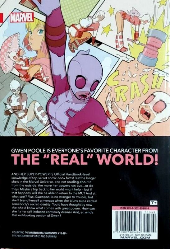 Résumé: Gwen Poole is everyone's favorite character from the "real" world! And her super-power is Official Handbook-level knowledge of top-secret comic-book facts! But the longer she's in the Marvel Universe, and not reading about it from the outside, the more her powers run out...or do they? Maybe a trip back to her world might help - but if that happens, will she be able to return to the MU? And at what cost? Plus: Gwenpool is no stranger to trouble, but she'll brand herself a menace when she blurts out a certain somebody's secret identity! You'd have thought by now that she'd know what comes with great power. How can she fix her self-induced continuity drama? And, er, who's that evil-looking version of Gwen?