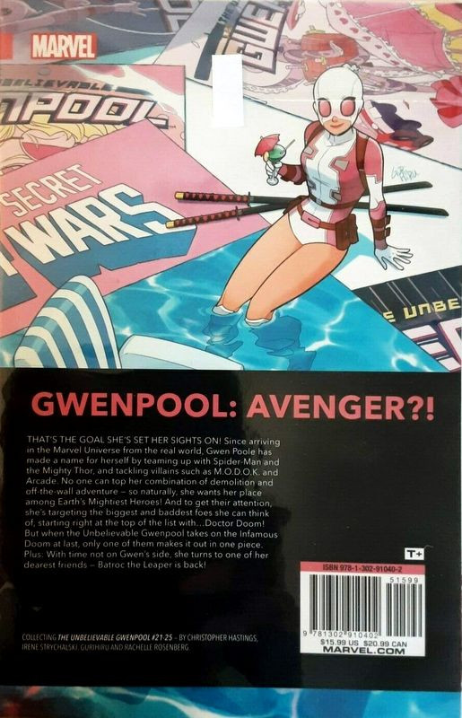 Résumé: The comics-loving, fourth-wall-breaking heroine known as GWENPOOL (A.K.A. Gwen Poole) is back in her most exciting adventure yet! Sure, masquerading as a super hero, fi ghting bad guys, and hanging out with her idols has been fun. However, in order to ensure her survival in the Marvel Universe, Gwen wants to take on the biggest and baddest baddies she can think of...