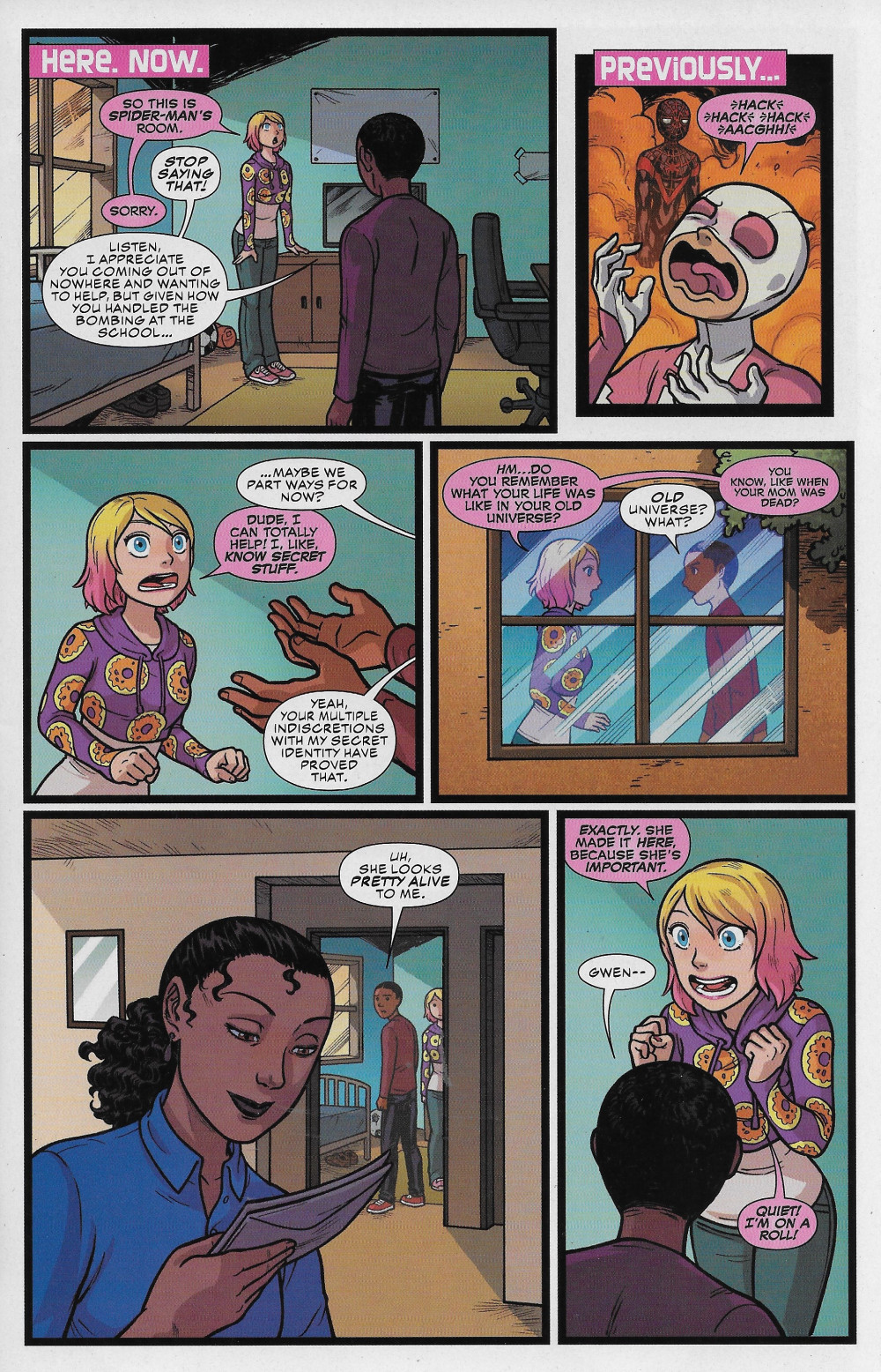Gwen’s “team-up” with Miles Morales ends…badly! Man, oh, man, she is not a good person! It gets dark! We promise this is not a Civil War II tie-in!