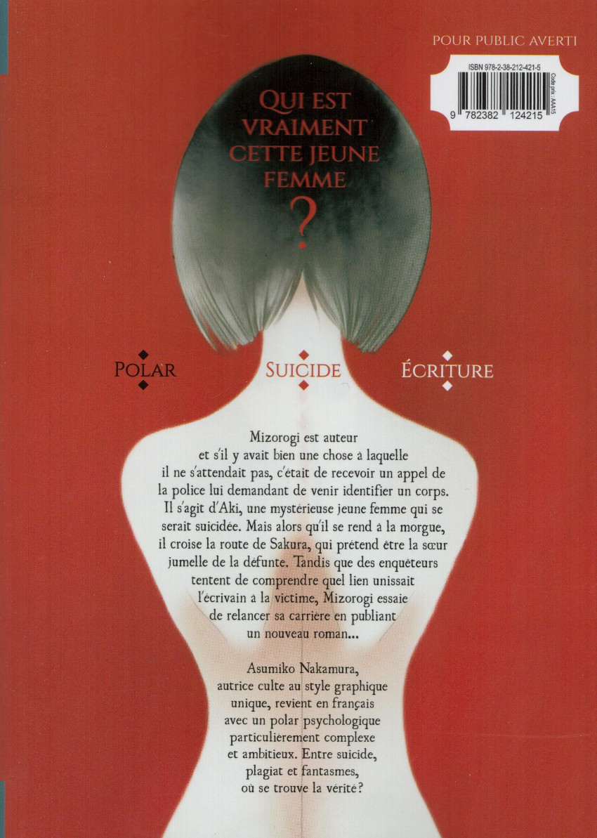 Un manga en deux tomes, sorti en France aux Éditions Akata. Dans ce thriller, l’autrice Asumiko Nakamura raconte une étrange affaire de suicide, concernant deux jumelles à l’identité insaisissable (jugez-en les couvertures), une histoire volée... Les corps graciles des personnages, ainsi que les fantasmes sexuels qui les tourmentent, renforcent l’atmosphère malaisante du livre, à ne pas mettre entre toutes les mains. Ainsi, le style d’Asumiko Nakamura, particulièrement expressif, se distingue des dessins génériques que l’on peut trouver ailleurs, tout en gardant les principaux codes du manga : nuances de gris, trames, patchwork graphique, subjectivité, focale sur les personnages, personnages-témoins, personnage mannequin, story-manga... Mais pas de lignes de tension, car l’action est assez figée. L’autrice a d’autres biais pour représenter graphiquement les émotions de ses personnages, notamment leurs yeux hypnotisant... Néanmoins, je dois avouer que je n’en maîtrise pas tous les codes et que je préfère la BD européenne, de manière générale. De ce fait, je n’ai pas été profondément touché par cette œuvre - certes troublante - que j’ai trouvé un peu trop pathétique. De plus, en matière de polar, je reste marqué par le manga Monster, que j’ai pourtant lu il y a très longtemps... A lire, si l’on aime les mangas de ce type.BDGest 2014 - Tous droits réservés