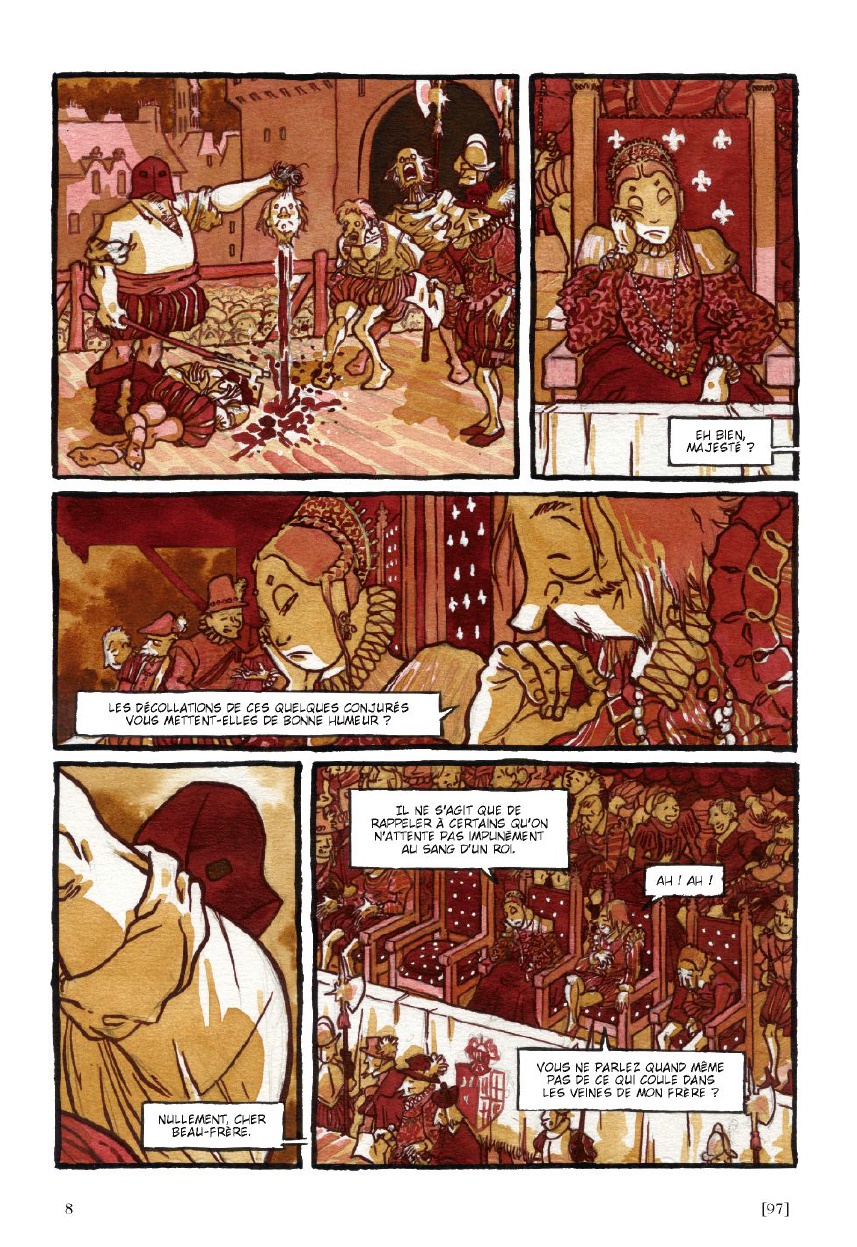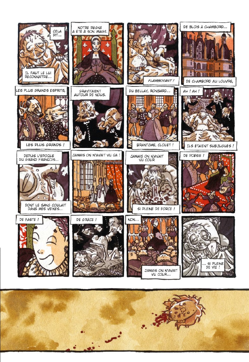 L'Histoire les oppose pour un même trône et Nicolas Junker s'est offert le pari de mettre en miroir ces deux figures féminines du XVIe siècle dans un diptyque sous forme de palindrome : jeux de cases et de mots qui se reflètent autour d'une double page centrale commune. Même si l'exercice n'est pas celui d'un historien, l'auteur a compulsé de nombreuses sources qui accréditent l'exercice. Le ton est à l'avenant du graphisme : décalé, moderne et dynamique. Un dépoussiérage qui rappelle l'insolence et la crudité d'un Jean Teulé.