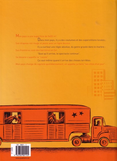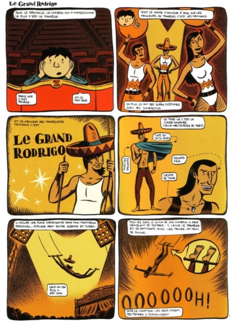 Ce one-shot est composé de plusieurs historiettes qui ont toutes pour toile de fond ce cadre original et sympathique qu’est le cirque. L’auteur, Rudy Spiessert, n’en est pas à son coup d’essai puisqu'en tant que dessinateur, il avait déjà présenté une certaine vision de notre société (Comme tout le monde) et nous avait aussi entraîné dans les aventures d’un viking non-violent (Ingmar Ingmar). Ce titre est néanmoins le premier projet qu'il mène de A à Z et il change de registre en ouvrant sa boîte à souvenirs de jeunesse. Ce n’est bien sûr pas la première fois qu’une BD aborde l’enfance. Récemment, Chaque chose de Neel ou Ma maman est en Amérique, elle a rencontré Buffalo Bill de Bravo et Régnault l'ont fait. Le récit de Spiessert est en partie autobiographique puisque l’auteur a lui-même vécu dans un cirque jusqu’à ses douze ans. Pour un gamin c’est un monde extraordinaire peuplé d'animaux, de clowns et autres saltimbanques. Certes, c’est un univers qui fait rêver et apporte du bonheur aux gens mais l’auteur montre également l’autre côté du miroir, c'est à dire la vie quotidienne non seulement des artistes une fois qu’ils ont rangé leurs habits de lumière mais également tous les métiers de l’ombre sans qui le monde du cirque n'existerait pas. Et de découvrir, entre autres : le flêcheur, les pistards et un chef monteur haut en couleur dont le seul prénom est déjà tout un programme, Eusice. Bref, le ton est donné : nostalgique, dans le bon sens du terme, mais également humoristique, le tout dans un contexte tout ce qu’il y a de plus réel.