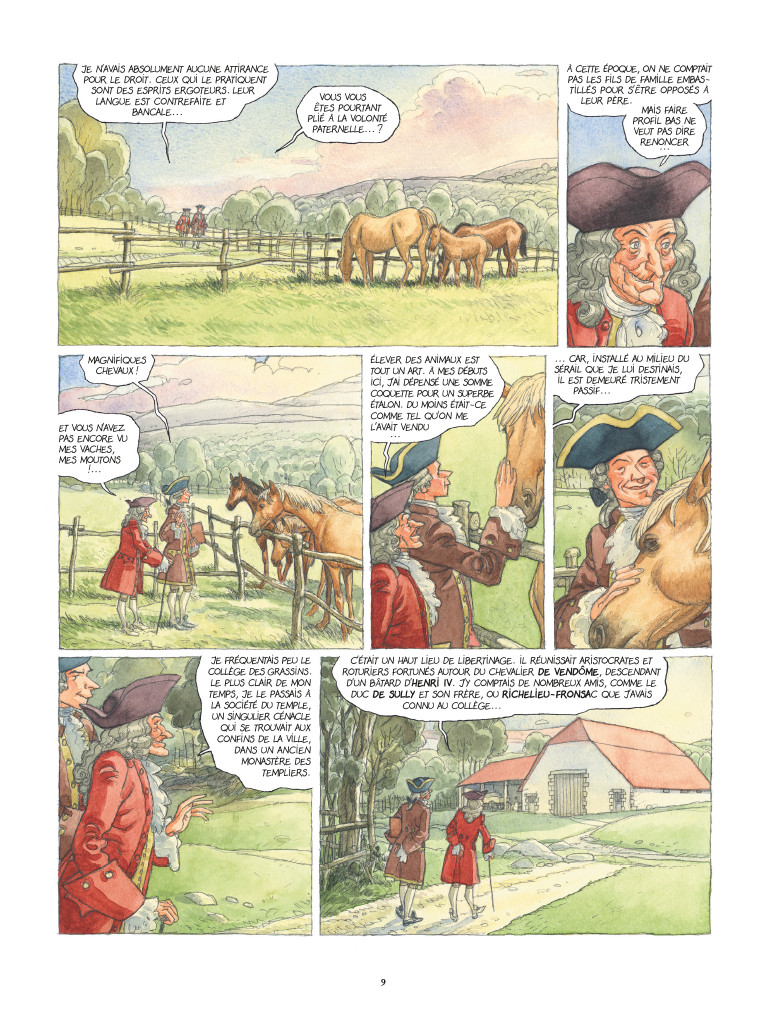 Au soir de sa vie, Voltaire accepte, en son château de Ferney, situé près de la Suisse, de recevoir Lasalle qui souhaite rédiger sa biographie. Voltaire lui raconte alors quelques épisodes marquants de sa vie : adolescence, premiers pamphlets, premières pièces de théâtre, premières amantes, premiers embastillements, … , jusqu'à arriver à son âge avancé où le philosophe a pris la place de l'homme de lettres et n'hésite pas à s'engager dans des procès iniques qui ont le don de le faire enrager par la stupidité des juges et des curés, personnes d'un autre âge qui ne voient pas que le monde et les idées ont évolué. Critique : Ce livre qui déplaira aux amateurs d'action par son côté narratif, enchantera ceux qui veulent découvrir Voltaire, son oeuvre et son temps. Philippe Richelle, le scénariste, ne cherche nullement à présenter l'écrivain comme un individu d'une rectitude parfaite, puisqu'on parle là de celui qui fut sans doute le plus grand philosophe des lumières. Bien au contraire, Philippe Richelle nous montre également des aspects du personnage nettement moins séduisants. Ainsi, Voltaire s'est moqué du Régent (qui gouverne après la mort de Louis XIV jusqu'à ce que Louis XV soit en âge de monter sur le trône) qui était un brave homme « progressiste », animé de l'esprit des lumières, simplement pour permettre au sieur Voltaire de faire parler de lui, de se faire connaître, car, quoi de mieux que de susciter un scandale pour que l'on parle de vous ? le scénario désarçonnera certains lecteurs par son découpage car l'on passe d'une époque à une autre par un effet de yo-yo pas toujours facile à saisir, mais que l'on comprend si on pratique une lecture attentive. Le scénariste accorde une place de choix aux maîtresses De Voltaire, non pour appâter le public par des scènes lubriques, mais tout simplement parce qu'elles ont joué un rôle dans sa vie, en particulier Emilie du Châtelet qui, mériterait bien une bande dessinée centrée sur sa personne. Femme tout-à-fait exceptionnelle, voici ce qu'en dit Wikipédia : « mathématicienne, femme de lettres et physicienne française. Elle est renommée pour la traduction en français des Principia Mathematica de Newton qui fait encore autorité aujourd'hui. Elle-même expérimentatrice, elle a contribué non seulement à populariser en France l'oeuvre physique de Leibniz, mais a aussi démontré par l'expérience que l'énergie cinétique (appelée à l'époque « force vive »), était bien proportionnelle, comme il l'avait formulé, à la masse et au carré de la vitesse. Voltaire, avec qui elle entretient une liaison de quinze ans, l'encouragea à poursuivre ses recherches scientifiques. » Le dessinateur, Jean-Michel Beuriot, accomplit ici une oeuvre très personnelle et ayant nécessité un travail de recherche considérable pour représenter Voltaire à son époque. Beuriot a appliqué directement les couleurs sur les planches originales qui ont ensuite été scannées pour pouvoir y inclure les « bulles » et effectuer la mise en page. Un important travail à la palette graphique a complété l'ouvrage. Jean-Michel Beuriot a opté pour les aquarelles que d'aucuns adoreront (j'en suis) et que d'autres déploreront car cette technique en bande dessinée surprend certains lecteurs habitués à des mises en couleurs plus classiques. Chaque case devient ainsi un vrai petit tableau. le lettrage est réalisé à partir de l'écriture du dessinateur, digitalisée pour en faire une police de caractères. Tout ceci explique pourquoi il a fallu pas moins de trois ans au dessinateur pour venir à bout de ce chef-d'oeuvre (si vous n'êtes pas d'accord avec moi, je ne vous ferai pas de procès, nous n'avons pas tous la même opinion et c'est très bien ainsi). Attention : le personnage de Lasalle, le « biographe » De Voltaire, est purement imaginaire ! Les autres « acteurs » de ce récit ont bel et bien existé. Ce double album est bien plus qu'une BD, un roman graphique, une biographie De Voltaire. Il est tout cela et un livre d'art en plus. Il met en lumière la dualité de cet homme aux idées de qui nous devons tant (séparation de l'église et de l'état, respect des libertés individuelles et collectives, démocratie représentative, droits des femmes à pouvoir être les égales des hommes, …) et quelques côtés plus sombres (son goût immodéré pour l'argent, son opposition au suffrage universel, jugeant que tous les hommes n'étaient pas aptes à réfléchir suffisamment que pour élire sainement, …). Je pourrais encore vous chanter les louanges de cette BD pendant longtemps, mais je vous volerais du temps que vous pourriez employer au mieux en la lisant !Le 21/09/2019 à 12:14:39