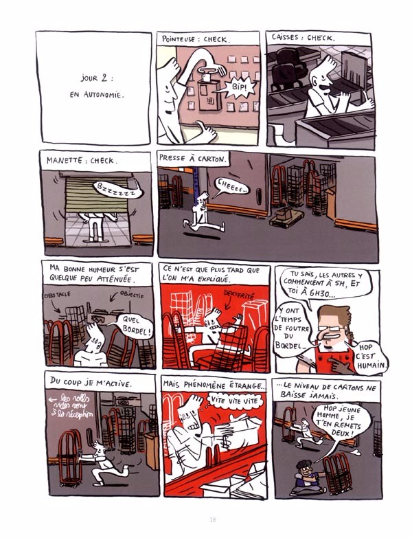 C’est vrai que de nos jours, n’importe qui peut composer une bd sur n’importe quoi. Il suffit par exemple de faire un stage d’été dans la réserve d’un hypermarché Leclerc en Alsace pour voir paraître son œuvre sous la forme d’un documentaire. On retiendra surtout l’expérience vécu par l’auteur dont c’est d’ailleurs également sa première bd à 24 ans seulement. Honnêtement, il n’y a rien d’extraordinaire de faire une randonnée en Australie ou de faire magasinier à plier des cartons dans l’arrière-boutique d’une grande surface. Cela me rappelle un peu la démarche de Trashed de l’américain Backderf. Bref, un sujet peu intéressant sur lequel on essaye de broder en ajoutant plein d’anecdotes. Cela se passe tout près de chez moi d’où une certaine curiosité de ma part bien que je ne le savais pas en empruntant cette bd. Pour autant, j’ai failli presque m’ennuyer mais ce ne fut pas le cas au fur et à mesure de ma lecture bien qu’il y ait également des passages assez inutiles. A vrai dire, j’ai apprécié le propos ainsi que les réflexions de l’auteur qui crache un peu dans la soupe tout en développant des arguments intéressants et non dénués de réflexion. Si j’avais été DRH, je ne l’aurais jamais employé car c’est un manque total de loyauté. Pour le reste, cela s’apparente malheureusement à la vérité. Bon, il faut bien avouer qu’il ne perd pas grand-chose à moins d’avoir un procès en diffamation de la part du patron de cette enseigne. En même temps, il est dans le trio de tête des patrons préférés des français dans le numéro de capital de ce mois-ci. Cette lecture tombe bien pour resituer les choses à leur juste valeur. On se focalise très souvent contre le patron radin de la vraie vie face à celui qui lutte pour les petits prix pour les consommateurs. Cependant, ce n’est pas aussi simple dans les faits. Tout y passe. De ces petits chefs qui empoisonnent la journée des petits employés pour 5 minutes de retard ou un coup de fil personnel passé au travail. Je crois que le pire est la destruction des aliments non vendus et qui ne peuvent être consommé par les employés ou donnés à des associations telles que les restos du cœur. On verra des bouteilles de champagne Mumm couler dans le caniveau. Les rats seront contents. Par ailleurs, on verra également les caissières qui sont virés comme des malpropres pour avoir dérober un coupon de réduction. Parallèlement, il y aura les directeurs véreux qui ont trempé dans des magouilles qui partent avec un gros chèque de compensation après avoir fait tellement de mal à leurs employés. Inutile également de parler des cadres surpayés et des employés presque au salaire minimum avec des conditions de travail épouvantables. Cependant, on parlera de famille ainsi que d’esprit d’équipe tout en exhibant le petit magasinier qui a réussi sa vie en terminant directeur comme pour appâter la galerie. Chez Leclerc, on sait qu’on achète moins cher. Toute concurrence est laminée. Les producteurs souffrent également au vu du prix d’achat. Que dire également de ces clients aux comportements ignobles qui s’estiment être les rois dans ce royaume de la consommation. Inutile également de dire que c’est le 1% qui contrôle 99% des richesses qui donnent du travail à l’immense majorité de la population et qu’en échange, on leur doit au minimum de la gratitude qui peut être sous forme d’adoration ou de prosternation (au choix). Je vais souvent faire mes courses à Leclerc et non, ce n’est pas moins cher qu’ailleurs. Désormais, j’aurais sans doute un autre regard grâce à cette exposition des coulisses cachées de cet hypermarché qui aime bien nous donner des illusions. Bon travail réalisé avec un dessin simple et moderne mais efficace comme le propos non dénué d’humour.BDGest 2014 - Tous droits réservés