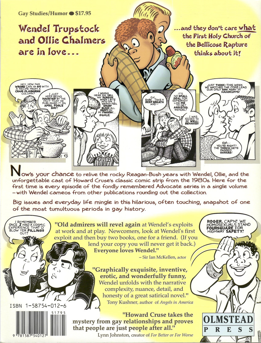 Résumé: "Wendel" was the first successful, long-lived gay comic strip, run in the Advocate in the years 1983 to 1985 and, after a year's hiatus, 1986 to 1989. Its hero, Wendel Trupstock, was initially fresh out of college and lookin' for love in a middle-sized city cosmopolitan enough to have an arts and theater community and, more important, a gay and lesbian community. Because of the first community, Wendel met Ollie Chalmers, an aspiring actor. The two became lovers, and the strip thereafter dealt with their relationship, their friends and families, their gay community, and their interactions with Ollie's ex-wife and small son. Cruse's superb comedic sense made "Wendel" funnier than nearly every other gay strip (then and since) and most nongay strips with continuing characters and situations. Cruse championed gay liberation, and he brought AIDS forthrightly into the strip, but his humor and ebullient drawing style prevented "Wendel" from being sententious, self-righteous, or maudlin. Because the strip appeared amid the Advocate's sex ads, Cruse could indulge ribaldry and nudity to his heart's content, secure in the knowledge that his style would make "Wendel," whose cast look like older siblings of "Archie" and "Fat Albert," merely cheerily bawdy. Indeed, one of the strip's greatest accomplishments was to portray sex as just another component in the lives of characters who do all the other things "regular" people do, albeit more hilariously. By Ray Olson.