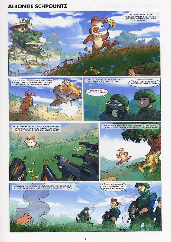 Il fallait y penser ! Mettre une troupe de soldats déjantés à la conquête de l'espace. Ils font "atomiser" les planètes à cause de leurs bêtises et pousse un petit "oups". Ce n'est pas très marrant car on prend vite fait et cause pour les pauvres petites créatures inoffensives. On retrouve le décor de films comme Starship Troopers ou bien encore Star Wars avec quelques clins d’œil pour d'autres films culte comme Alien. Les couleurs sont beaucoup trop traitées informatiquement pour être véritablement belles. Les dessins paraissent également trop en rondeur; ce n'est pourtant pas si désagréable que cela à la vue. Les auteurs ont voulu faire passer avec ces albums un moment de franche rigolade pour les lecteurs amateurs de science-fiction. Cela peut prendre quelque fois mais à de trop rares fois à mon goût.Le 23/01/2006 à 17:37:45