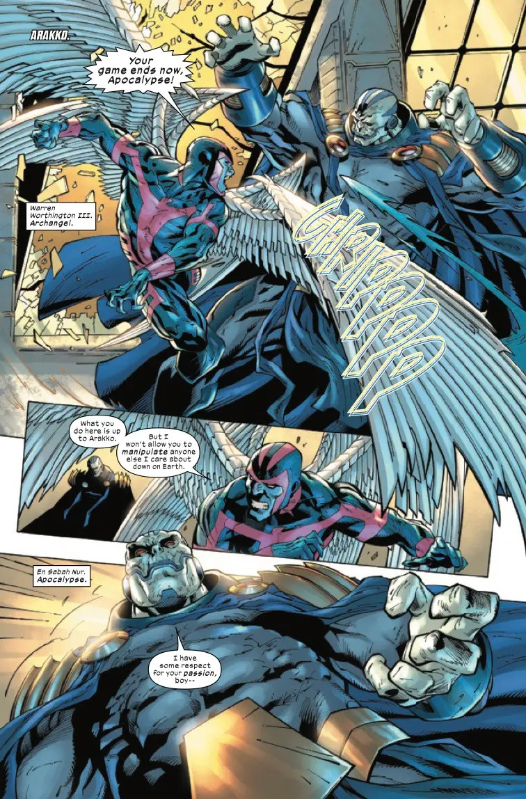 Résumé: Warren Worthington III long ago — and at great cost — made peace with the seed of Death that Apocalypse planted within him. But as the contest to choose an heir rages on, ARCHANGEL takes the fight to Apocalypse himself, to make sure no one else suffers at the hands of En Sabah Nur!