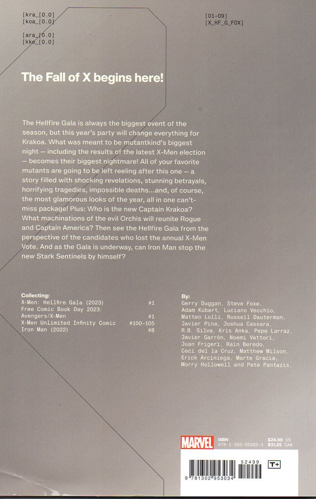 - Info édition : Collects X-Men : Hellfrie Gala (2023) #1 & FCBD 2023 & Avengers/X-Men #1 & X-Men Unlimited Infinity Comic #100-105 & Iron Man (2022) #8
