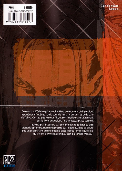 Résumé: Ce n’est pas Kûshirô qui accueille Haru au moment où il parvient à pénétrer à l’intérieur de la tour de Yamata, au-dessus de la baie de Tokyo, mais sa petite soeur, Aki, et son « meilleur ami », Kazunari, sur le front duquel Jin, l’alchimiste, a placé son oeil. Battu à plate couture par son ami et choqué par ce qu’il vient d’apprendre, Haru finit prostré sur le bateau. Il ne se doute pas un seul instant qu’une bataille encore plus terrible que celle qu’il vient de vivre l’attend au sein du fort de Wakasu !