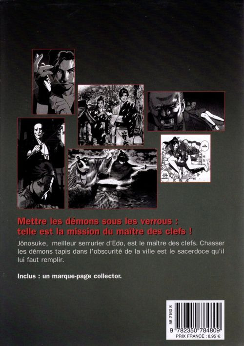 Résumé: Un serrurier mystique et une divinatrice font régner la justice en luttant contre les forces occultes qui menacent le Japon de l'époque d'Edo ! Grâce au shogounat, le peuple vit dans la paix et dans une relative prospérité. Pourtant, la part sombre du coeur des hommes ne cesse d'exciter leur cupidité : elle est la porte d'entrée idéale pour tous les démons qui cherchent à passer dans leur monde. Exorciser ces démons, c'est la mission de Jônosuke, le Maître des clefs. Connu pour être le meilleur serrurier d'Edo, Jônosuke use de cadenas un peu particuliers pour mettre sous les verrous les