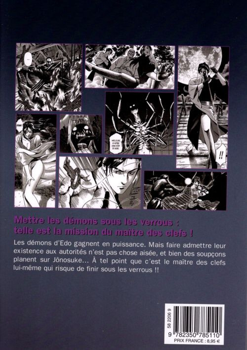Résumé: Cadavres dépourvus d’yeux, oreilles et langues arrachées, des meurtres peu communs font trembler Edo. Jônosuke, tentant de découvrir leurs coupables, se rend sur les lieux de ces crimes... Mais sa présence finit par éveiller les soupçons de Domon, le capitaine de la police de la ville. Mis aux fers, Jônosuke aura bien du mal à faire admettre l’existence des démons à l’officier avant de retrouver sa liberté. Pour faire face à l’augmentation du nombre de ces êtres maléfiques, le serrurier, en manque de cadenas, se rend chez son ferronnier et compagnon d’armes, Tetsujû. Les vagues charrient alors sur la plage le corps d’une femme que nos héros recueillent. Amnésique, le seul indice permettant de faire le lien avec son passé est une mystérieuse clef... Mais avant d’avoir le temps de poursuivre plus avant les investigations, des ninjas apparaissent et enlèvent la belle inconnue...