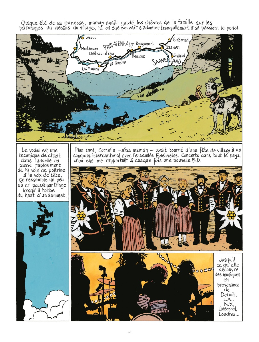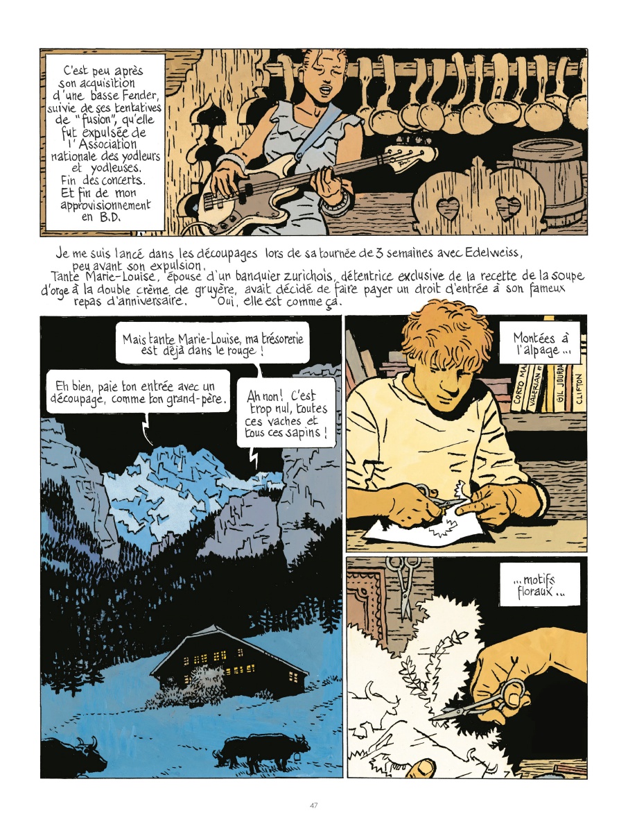 À noter l’étrange configuration de l’album : l’histoire est précédée d’une longue préface documentée sur la tradition suisse du papier découpé, d’un étrange prologue dessiné par Maou, et d’un copieux carnet d’esquisses. L’ensemble crée un livre étrange mais très intéressant. Dommage toutefois que la superbe couverture n’ait que très peu de rapport avec l’histoire. Autre particularité, il n’y a ni vernis ni pelliculage, ce qui rend l’album vraiment fragile.