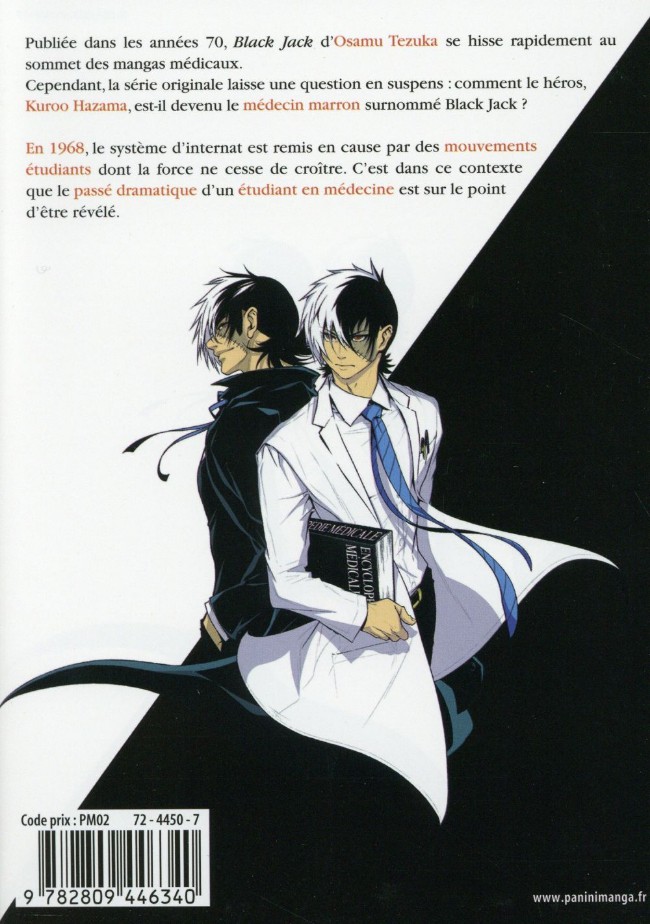 Résumé: L’action se situe vers la fin des années 60. On y découvre Hazama Kuro, un jeune étudiant en médecine, défiguré par une longue balafre lui barrant la joue. Ce jeune prodige de la médecine va devenir Black Jack, le mystérieux chirurgien auquel on fait appel quand tout espoir a disparu. Plus qu’une simple histoire de médecine, la série intègre de nombreuses références à la situation internationale et aux conditions sociales du Japon de la fin des années 60.