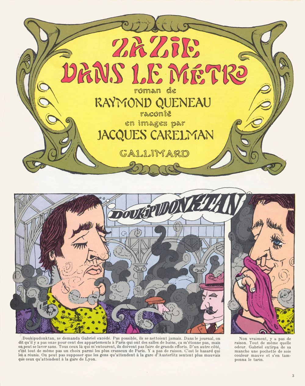 L'auteur de "Zazie dans le métro", Raymond Queneau, était un écrivain. Il a écrit d'autres romans. Il a également écrit les paroles de la chanson "Si tu crois qu'ça va, fillette, fillette..." mais il croyait que c'était un poème. Il a en plus créé l'Oulipo dont le nom (ou-vroir de li-ttérature po-tentielle) dit bien ce qu'il veut dire! Jacques Carelman était un artiste peintre et illustrateur. Il a par ailleurs illustré un Catalogue d'objets introuvable avant de s'arranger pour qu'on puisse les trouver. Ici, il a illustré le roman de Queneau à la manière des Pieds Nickelés (version Forton): non seulement le texte est imprimé en dessous des cases, mais en plus il y a des phylactères où les personnages expriment un court extrait de leur réplique. Mais comme il est moderne (on est en 1966, tout de même) à chaque fois la typographie de la bulle indique le caractère ou l'humeur de celui qui cause. Et la mise en page est plus dynamique que celle de l'Epatant. Quand à l'histoire c'est celle d'une pré(pré?)-ado qui va passer trois jours à Paris chez son tonton. Une histoire simple qui va se révéler plus complexe qu'il ne parait. Il en est de même des personnages. Ne chipotons pas : "Zazie dans le métro" est une grande œuvre graphique greffée sur une grande œuvre littéraire. Selon BDGest, on ne trouve cet Album que dans 0,07% des collections. Je présume que les autres exemplaires ont été raflés par les musées...BDGest 2014 - Tous droits réservés
