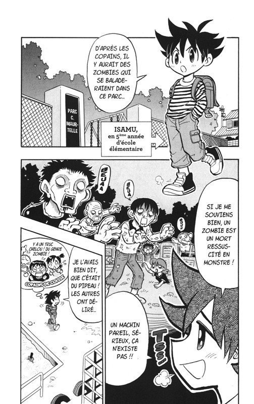 n promenade dans le parc C. Maurtelle, Isamu, un gamin de primaire, se dit que, décidément, ses petits camarades sont bien crédules. L’endroit est plus que paisible et il ne voit aucun des zombies dont ils lui ont parlé à l’horizon. Pourtant, au détour du bac à sable, il aperçoit une drôle de forme en partie ensevelie. Quand celle-ci s’anime, le gosse n’a plus de doute, il a affaire à un mort-vivant. La première vague de panique passée, il s’aperçoit vite que Zozo est plus drôle que méchant. D’ailleurs, son nouvel ami d’outre-tombe, particulièrement collant, est plutôt à plaindre avec son corps en kit prompt à tomber en ruine à la moindre occasion.