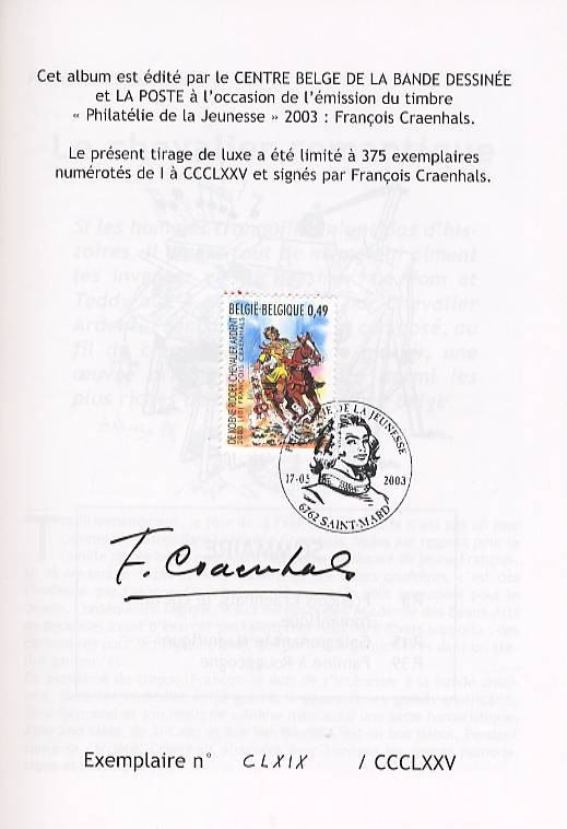 Info édition : Cet album est édité par le Centre Belge de la Bande Dessinée et La Poste belge à l'occasion de l'émission du timbre "Philatélie de la Jeunesse" 2003 : François Craenhals.Il comprend un dossier sur l'auteur avec illustrations & photos, et deux histoires inédites de Chevalier Ardent : "Galangrenant le Magnifique" et "Famine à Rougecogne".