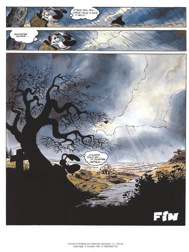 Sokal ne sait pas dessiner mais il est le fait bien. Oui, les mouvements, les perspectives ce n'est pas son truc mais l'ambiance, ça, carrément ça l'est! Car "Le chien debout" est malaisant au possible, poisseux de graisse, d'une brume gluante de boue et les esprits sont au diapason, visqueux et malsains. Sokal a un crayon d'huile et dessine avec du rouge qui tache. Et c'est si personnel et unique que c'est superbe de laideur crasse. Canardo est un Sam Spade de BD perfecto; Il en a tous les aspects. Alcoolique mais secondaire dans le récit, il demeure celui qui construit l'histoire jusqu'au final qui twiste sévère (un régal!) dans un détachement profond au drame qui se joue et un vague à l'âme de ses drames à lui que ce sont joués. Tout est noir. L'humour, les personnages, le dessin, les destinées et rien ne sortira de bon. Et c'est génial. A noter tout de même que dans ce 1er tome, Sokal fait le choix d'une civilisation animale qui est secondaire et esclave à la civilisation humaine. Le principe est excellent et cela construit un univers Humain/Animaux qui choisit la vision orwellienne de "la ferme des animaux" et qui rappelle aussi le Maitre/Esclave, Propriétaire/Laquais, Possédant/Valet. Dommage que Sokal ne réutilise pas cet univers là dans les prochains opus, cela donnait une couche supplémentaire à la visquosité sociale (en plus de l'histoire). Ce 1er tome ne va pas loin sur ce point mais il y a avait matière.Le 12/11/2023 à 10:43:45