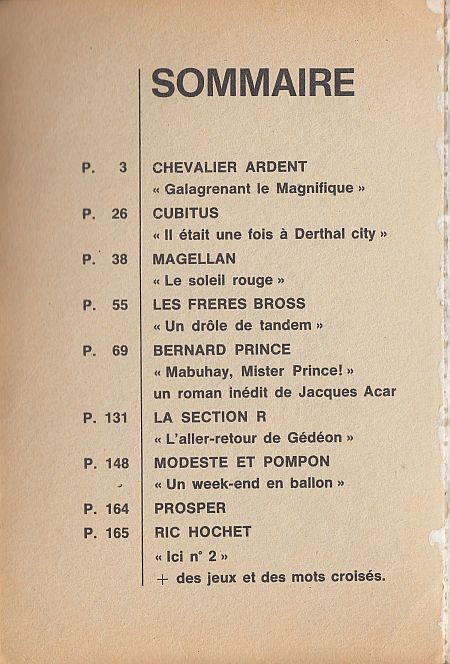 p. 3 : Craenhals, François p. 26 : Dupa p. 38 : Géri p. 55 : Guilmard ; sc. Vicq p. 69 : texte Acar, Jacques ; ill. Hermann p. 131 : Reding, Raymond p. 148 : Mittéï et Marc (Hardy) p. 164 : Ploeg p. 165 : Tibet ; sc. Duchâteau, André-Paul