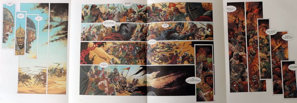 Voilà enfin une croisade digne de ce nom qui me plaît bien ! Non seulement nous avons un scénario à la fois habile et intelligent signé, il est vrai, par un grand maître mais nous pouvons également admirer un dessin qui possède la finesse du détail notamment des personnages et des décors. J'aime cette ambiance orientale entre ésotérisme et trahisons amoureuses. J'ai apprécié cette bataille qui couvre simultanément quatre pages dépliantes. C'est vraiment magnifique ! Comme quoi, à côté de sombres navets, il peut exister des merveilles graphiques qui ne demandent qu'à être feuilletées par des lecteurs avisés. On pourra également féliciter l'auteur d'avoir introduit l'histoire des huit croisades : ce fut réellement instructif. A découvrir en espérant que la suite nous étonne davantage. Le second tome sera dans la prolongation du premier avec un dessin qui nous émerveille toujours autant. Je dirai que j'ai un petit regret par le fait que les auteurs s'éloignent progressivement de la réalité historique pour se tourner vers le fantastique. Il faut dire qu'on sentait déjà une touche de magie et d'ésotérisme dès le commencement de cette épopée. Au 4ème tome, on s'aperçoit que ce n'est que la fin d'un cycle qui laisse la porte grande ouverte.Le 09/08/2020 à 15:11:55