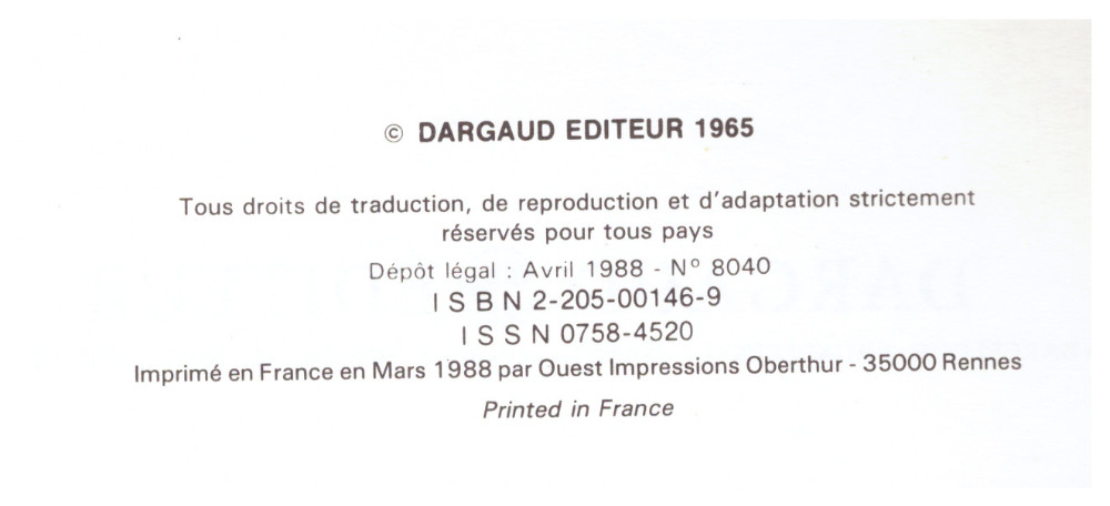 Info édition : Dépôt légal : avril 1988 - N° 8040 Imprimé en France en mars 1988 par Ouest Impressions Oberthur - 35000 Rennes ISBN en 2ème page et 4ème plat droit = 2-205-00146-9 24 albums au 4ème plat, ISBN à droite, code barre à gauche