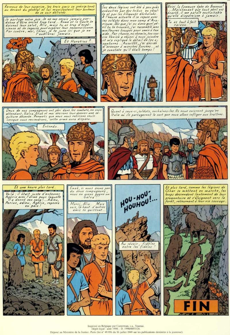 Le scénario est basé sur une relation historique allant de 390 avant J-C (épée de Bremmus) à 52 avant J-C (guerre entre Pompée et César). Jacques Martin plonge Alix dans le dilemme psychologique rester fidèle à César ou rejoindre Kildéric et les Gaulois. On notera l apparition du loup et du légionnaire Galva, amis d Alix (personnages récurrents). Le dessin des Alpes enneigées est un pur bonheur.