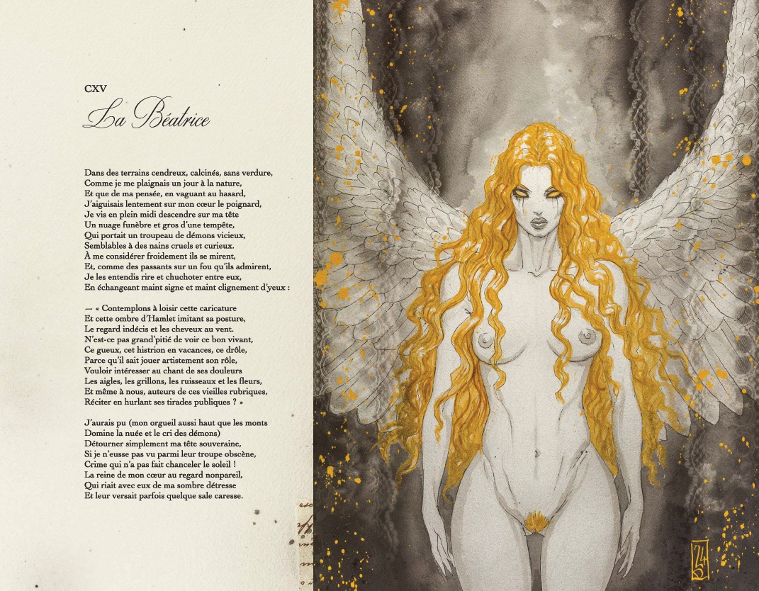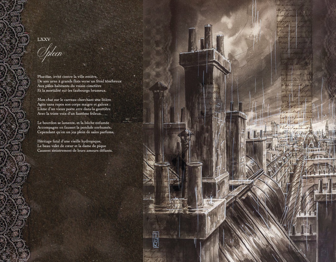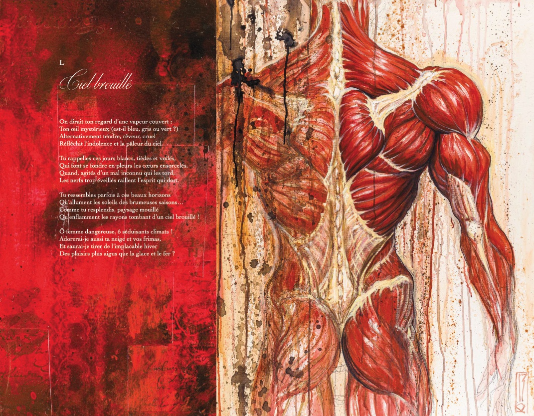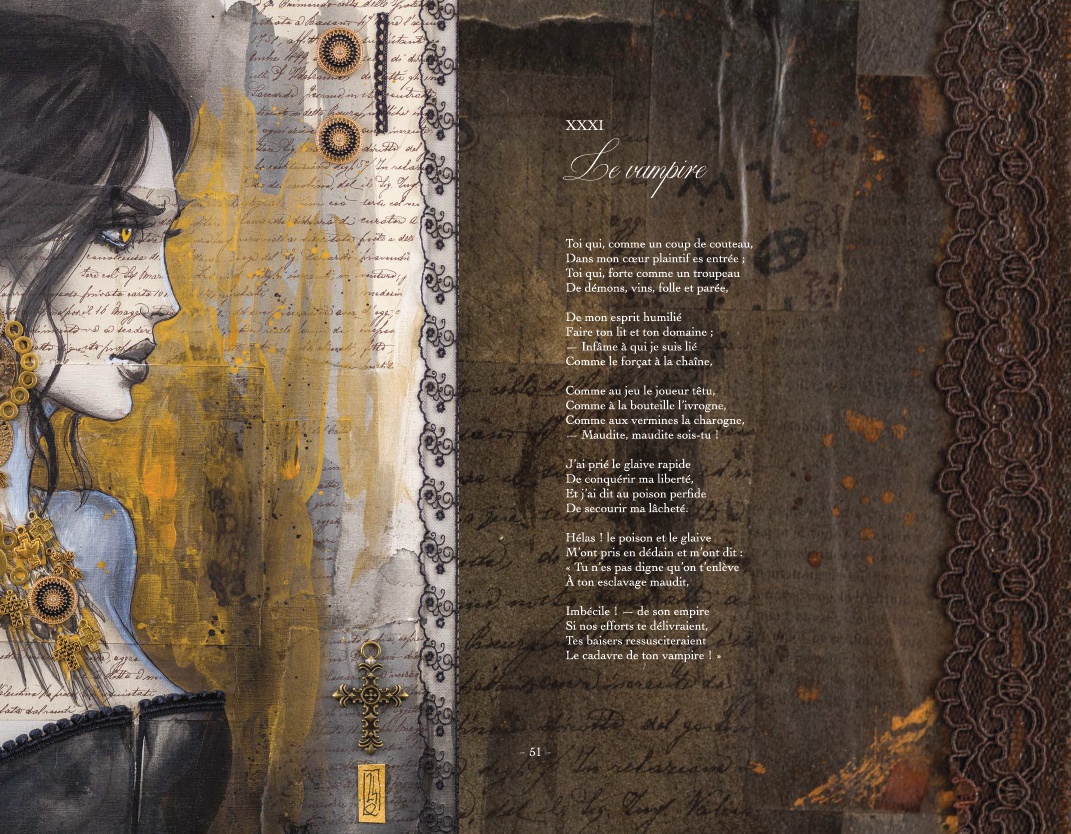 Illustrateur, peintre et auteur d'une trentaine de bandes dessinées (Le Troisième Oeil, Wika, Requiem, Chroniques de la Lune Noire), Olivier Ledroit revient avec un défi digne de son sens de la démesure, de sa générosité visuelle et de sa passion pour les mondes oniriques, en adaptant le chef-d'oeuvre de Charles Baudelaire, Les Fleurs du mal. En faisant revivre cette oeuvre, Olivier Ledroit propose un regard singulier sur l'univers du poète, à travers le prisme de son propre univers, si apprécié des amateurs de bande dessinée et des collectionneurs d'art. « Je ne souhaitais pas me contenter d'illustrer les poèmes de Baudelaire, détaille Olivier Ledroit. D'autres l'ont fait avant moi. L'objectif est plutôt de reproduire le bain culturel dans lequel a trempé Baudelaire. Ses visions, ses angoisses, ses inspirations, son monde, son Paris du XIXe siècle ». Connu pour ses incroyables planches épiques autant que pour la délicatesse et la sensualité de ses figures, de ses formes et de ses compositions, retrouvez dans les pages de ce bel ouvrage toute la puissance de son trait. Les femmes splendides côtoient ici les monuments parisiens, les chats, les têtes de mort et les fantasmes tirés de substances psychotropes. Tantôt éclatant de couleurs, tantôt mélancolique ou célébrant les corps féminins, c'est un voyage esthétique inédit au plus près du poète maudit du XIXe siècle que nous propose Olivier Ledroit dans ce superbe ouvrage en grand format à l'italienne.