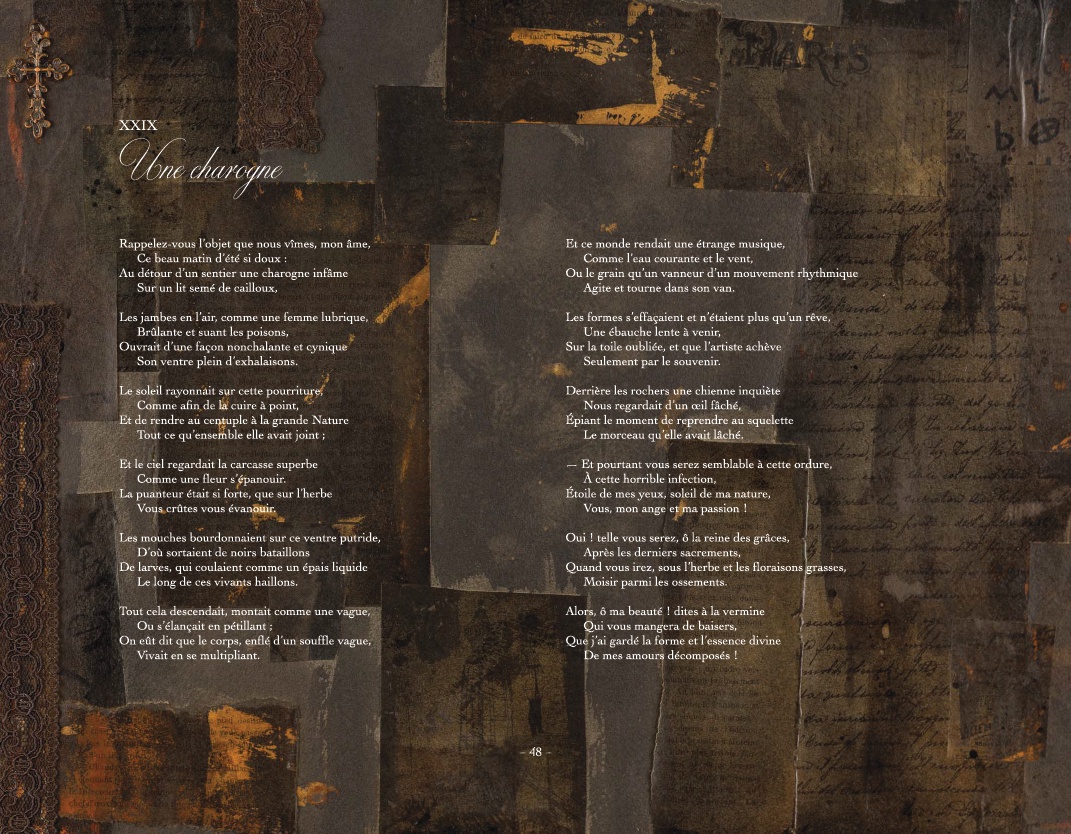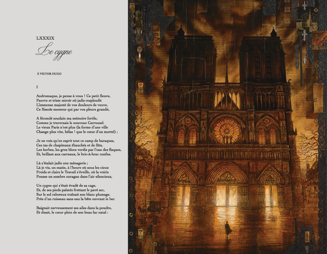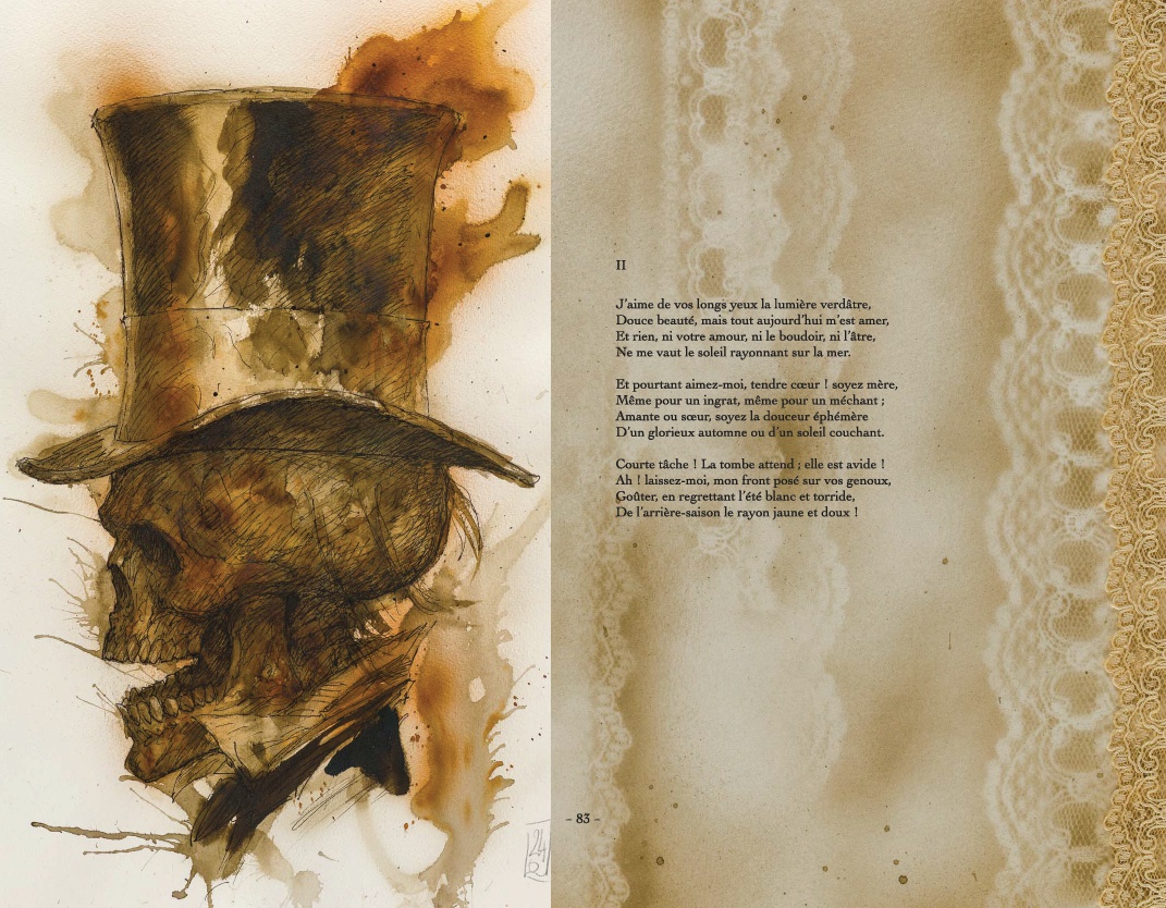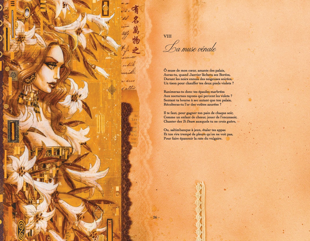 Illustrateur, peintre et auteur d'une trentaine de bandes dessinées (Le Troisième Oeil, Wika, Requiem, Chroniques de la Lune Noire), Olivier Ledroit revient avec un défi digne de son sens de la démesure, de sa générosité visuelle et de sa passion pour les mondes oniriques, en adaptant le chef-d'oeuvre de Charles Baudelaire, Les Fleurs du mal. En faisant revivre cette oeuvre, Olivier Ledroit propose un regard singulier sur l'univers du poète, à travers le prisme de son propre univers, si apprécié des amateurs de bande dessinée et des collectionneurs d'art. « Je ne souhaitais pas me contenter d'illustrer les poèmes de Baudelaire, détaille Olivier Ledroit. D'autres l'ont fait avant moi. L'objectif est plutôt de reproduire le bain culturel dans lequel a trempé Baudelaire. Ses visions, ses angoisses, ses inspirations, son monde, son Paris du XIXe siècle ». Connu pour ses incroyables planches épiques autant que pour la délicatesse et la sensualité de ses figures, de ses formes et de ses compositions, retrouvez dans les pages de ce bel ouvrage toute la puissance de son trait. Les femmes splendides côtoient ici les monuments parisiens, les chats, les têtes de mort et les fantasmes tirés de substances psychotropes. Tantôt éclatant de couleurs, tantôt mélancolique ou célébrant les corps féminins, c'est un voyage esthétique inédit au plus près du poète maudit du XIXe siècle que nous propose Olivier Ledroit dans ce superbe ouvrage en grand format à l'italienne.