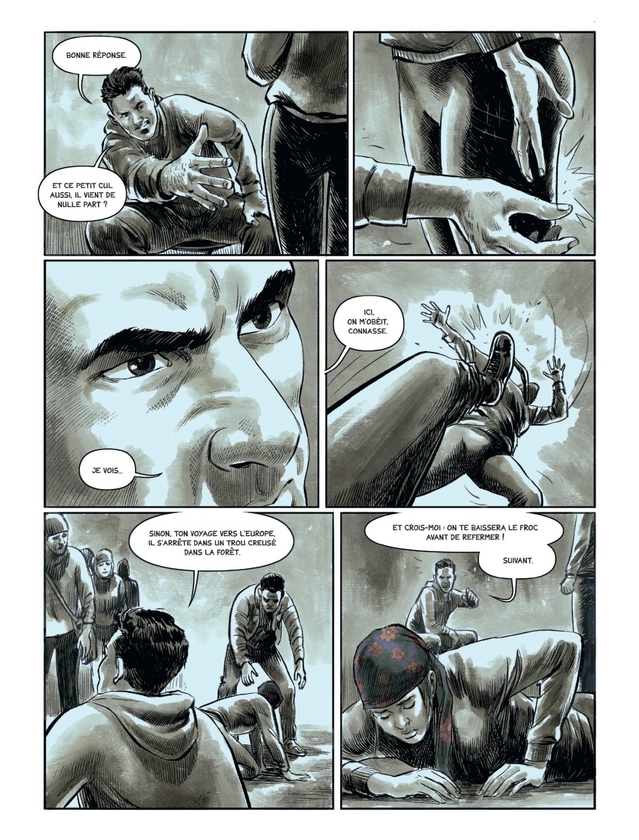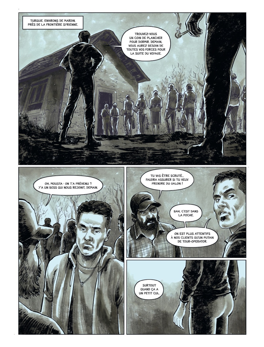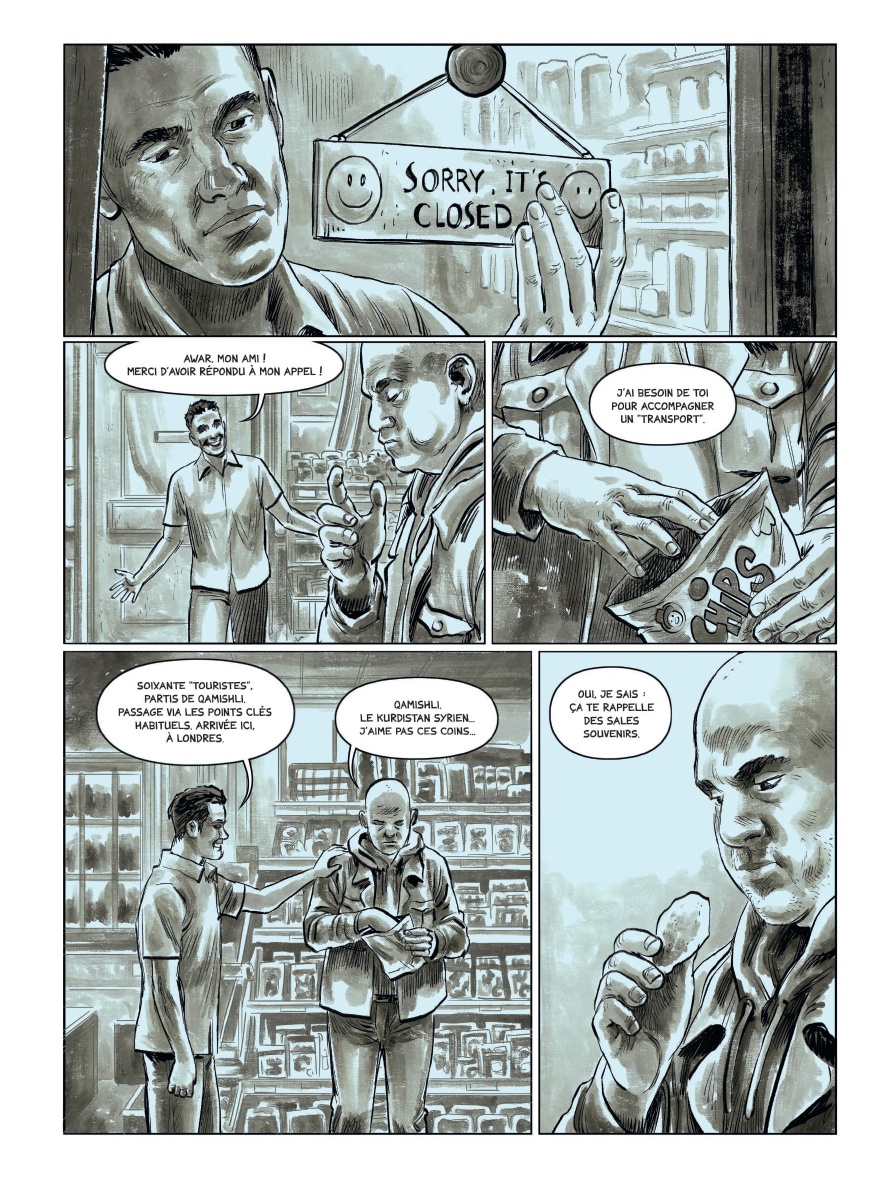 war le taiseux porte des baskets de luxe grâce à son lucratif job de passeur. Mais il porte aussi un douloureux passé que va réveiller Esrin, une jeune migrante kurde, fille de combattante fuyant l'enfer syrien. Laisser renaître son humanité ou pas ? Awar va devoir choisir... Car Soran, son boss, veut du chiffre et du résultat. Et Awar, plus tout jeune, voit bien que Musta, passeur ultraviolent fraîchement arrivé, lui prendrait volontiers sa place... Awar va-t-il oser prendre la porte de la rédemption ou la claquer définitivement ?