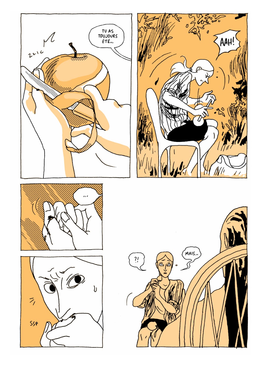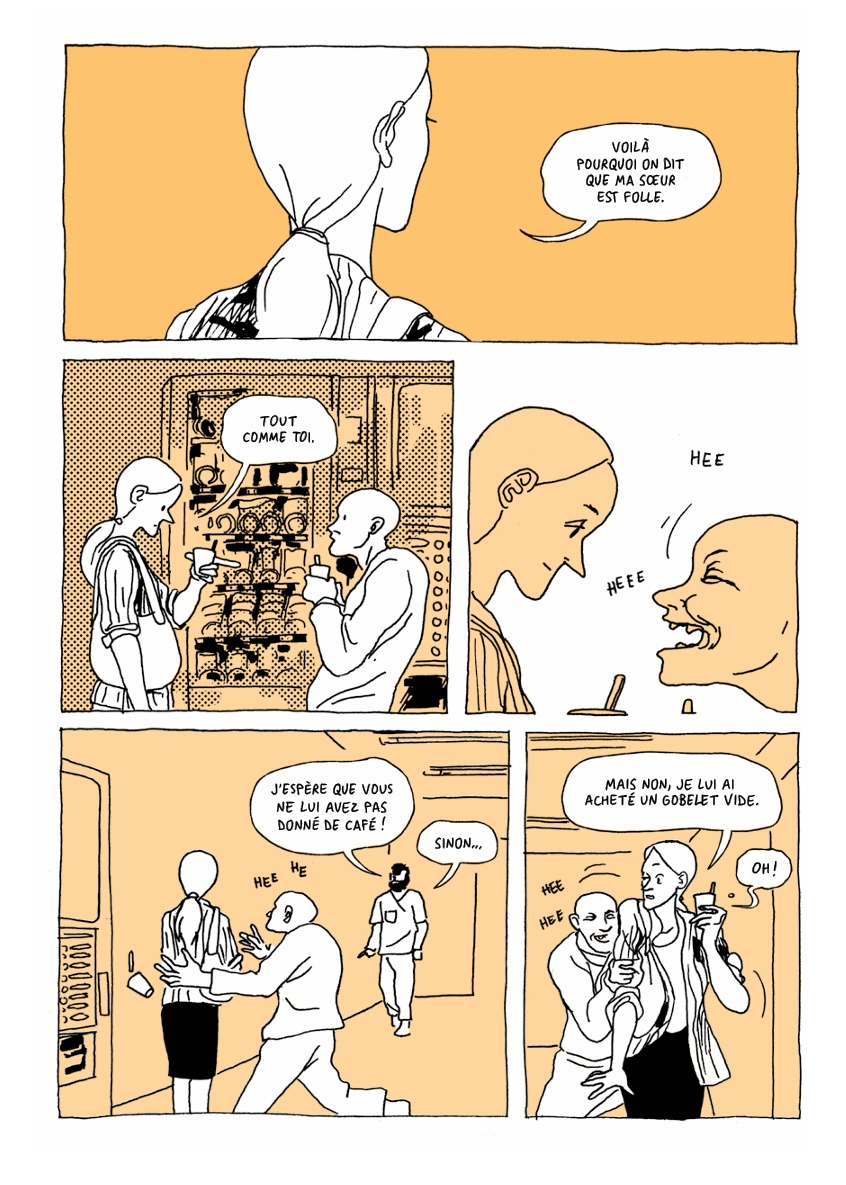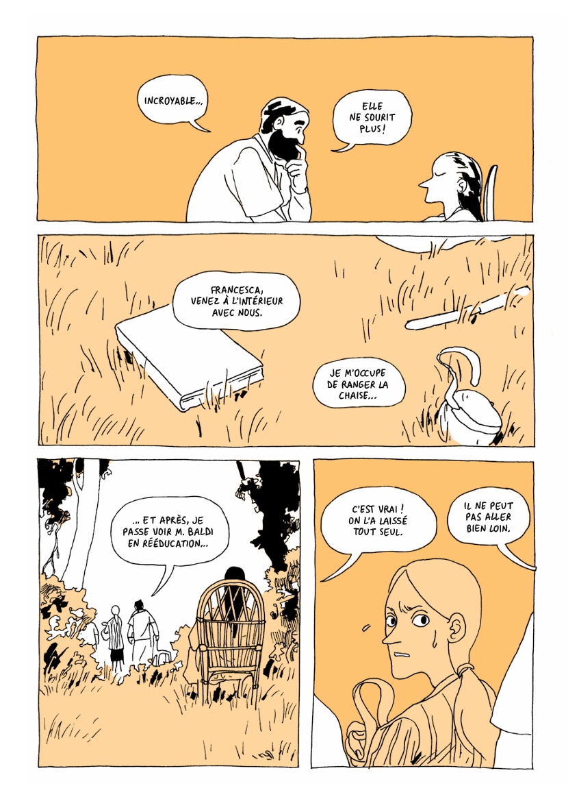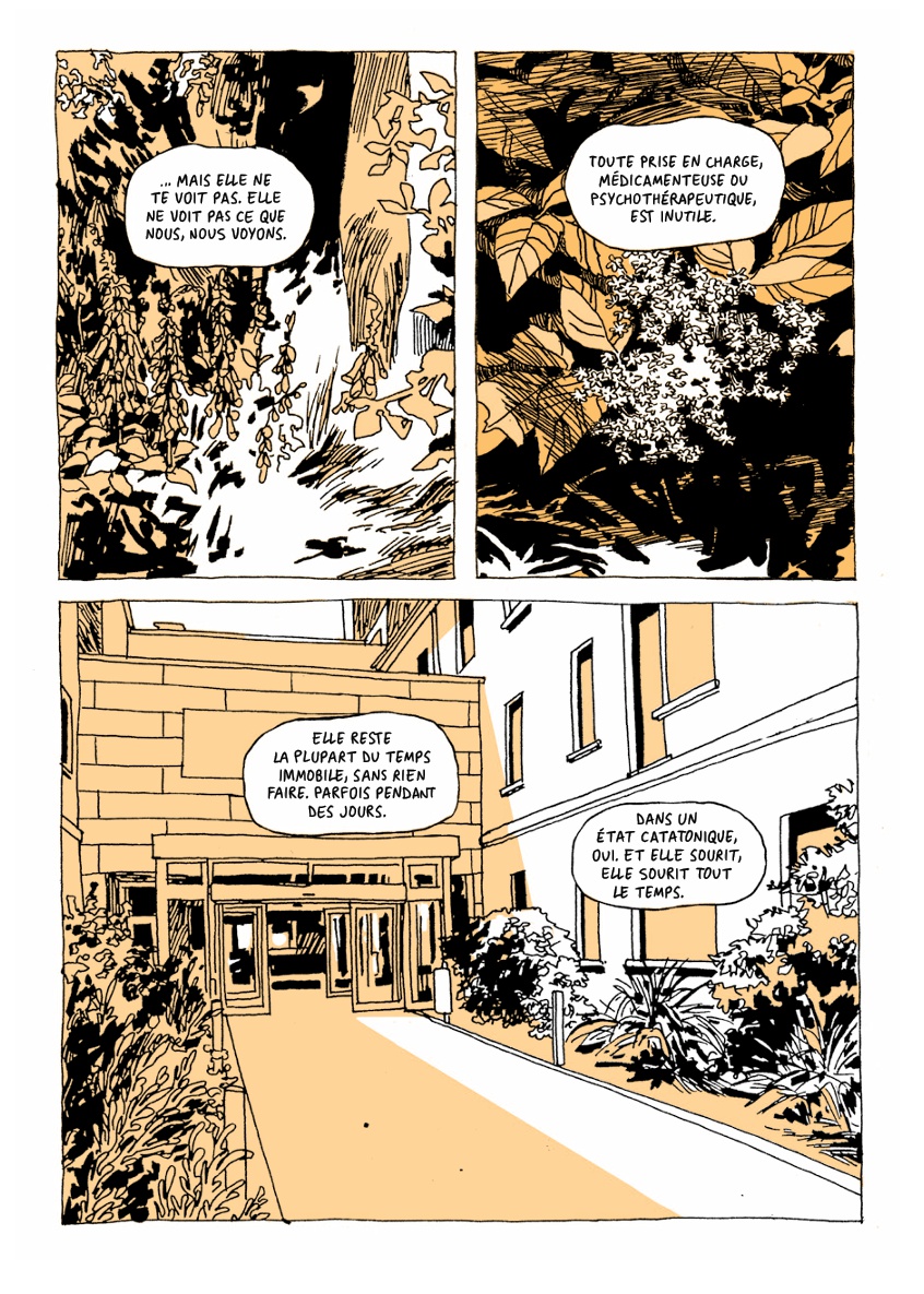 R ita Nocenti est folle. C'est du moins ce que disent ceux qui la connaissent et le dossier médical de la clinique psychiatrique où elle est soignée. Elle a toujours été étrange, mais maintenant elle est catatonique : elle ne parle pas, bouge peu, et elle sourit tout le temps. Les médecins ignorent la cause de son trouble et ne savent pas quel traitement lui faire suivre. Son seul lien avec le monde est sa soeur Francesca, qui la soutient, même si leur relation a toujours été compliquée. Un jour, Francesca se coupe en épluchant une pomme, et à la vue du sang, Rita cesse de sourire : cet épisode marque le début d'une série d'événements et de révélations aux rebondissements inattendus. Comme le dit Francesca, « le symptôme n'est que le résumé d'une histoire » : pour découvrir l'origine de cette maladie sans nom, il faudra creuser profondément. Les deux soeurs doivent retracer leurs expériences dans une série de flashbacks douloureux et éclairants, à la recherche d'une racine commune, d'un traumatisme qui, d'un seul coup, les a à la fois unies et séparées à jamais. Dans ce premier roman graphique d'une maturité surprenante et plusieurs fois primé, l'italienne Iris Biasio reconstruit le château de cartes d'une histoire familiale tortueuse, intense et débordante d'humanité
