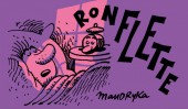Flip Book, avec au recto : Une longue métamorphose, pendant laquelle un homme dans son lit se transforme de mille manières avant de revenir au point de départ. Et au verso : Un escargot avance lentement vers une peau de banane, que va-t-il se passer ?
