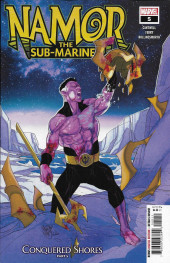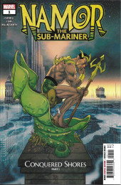 A century into the future, not much land remains on Earth. A combination of a worsening climate and a devastating war with the Kree has left the surface of the planet mostly inhospitable, with an ever-dwindling population of air-breathers and a profound lack of super heroes to protect them. Enter NAMOR, who these many years on is no longer King of Atlantis…but ruler of the entire world.